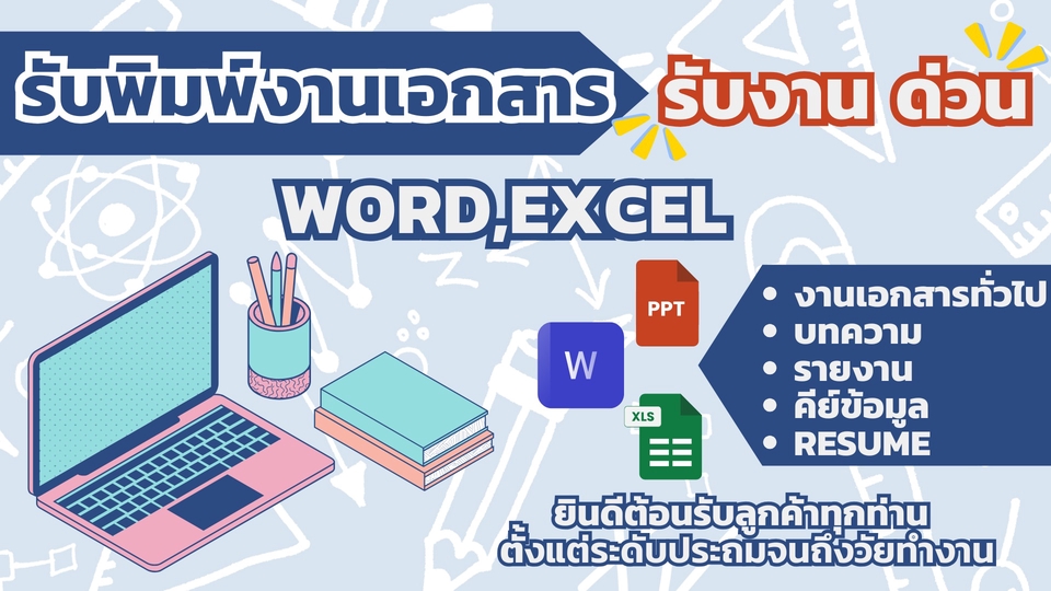 ยินดีต้อนรับลูกค้าทุกท่าน ตั้งแต่ประถมจนถึงวัยทำงาน - ใครทำงานไม่ทัน ให้เราช่วยเคลียร์ - เจ้าหน้าที่บริหารงานทั่วไปในมหาวิทยาลัย