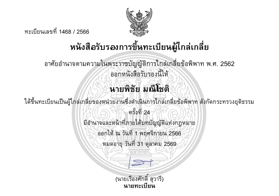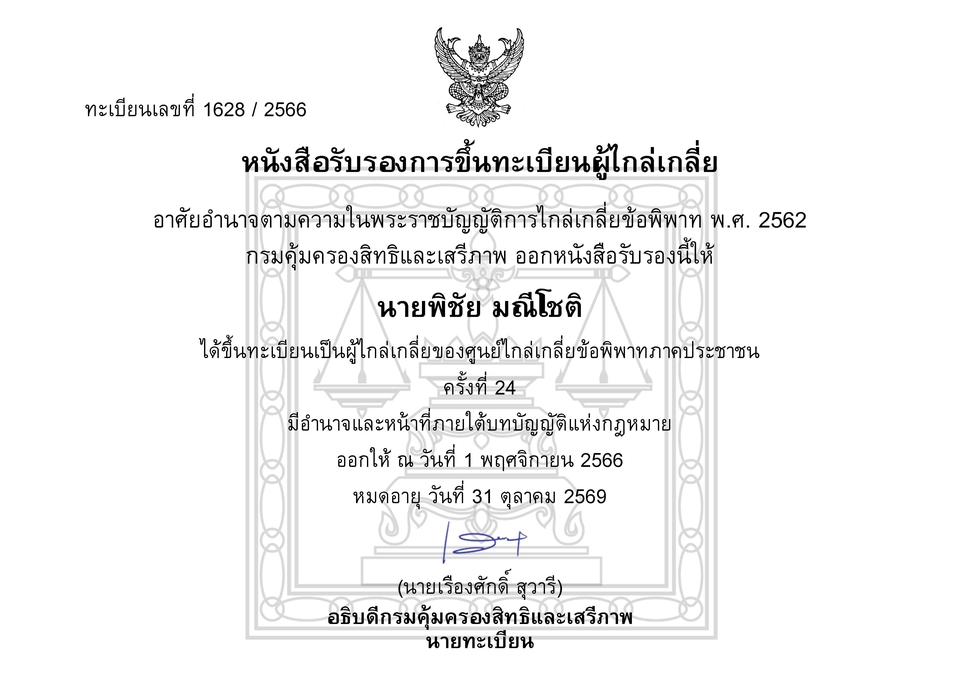 ให้คำปรึกษา และให้บริการเป็นผู้เจรจาไกล่เกลี่ยประนอมข้อพิพาท เกี่ยวกับปัญหาทางกฎหมายหรือคดีความ หรือกรณีพิพาทกันทางธุรกิจ หุ้นส่วน หรือบริษัท ทั้งปฎิบัติงานผ่านทางการประชุมออนไลน์ หรือประชุมนอกสถานที่ ทั้งที่สถานีตำรวจ สถานที่พิพาท และหน่วยงานต่างๆ ขั้นตอนการทำงาน 1. สอบข้อเท็จจริงเบื้องต้น 2. ขอข้อมูลเอกสารที่เกี่ยวข้อง 3. นัดหมายโทรศัพท์ สอบถามข้อมูลละเอียด และขอเอกสารเพิ่มเติม(ถ้ามี) 4. กำหนดกรอบการทำงานและระยะเวลา 5. ประสานงานทุกฝ่ายเพื่อกำหนดนัดหมาย 6. เข้าประชุมและเจรจาไกล่เกลี่ย 7. สรุปรายงานเป็นหนังสือ