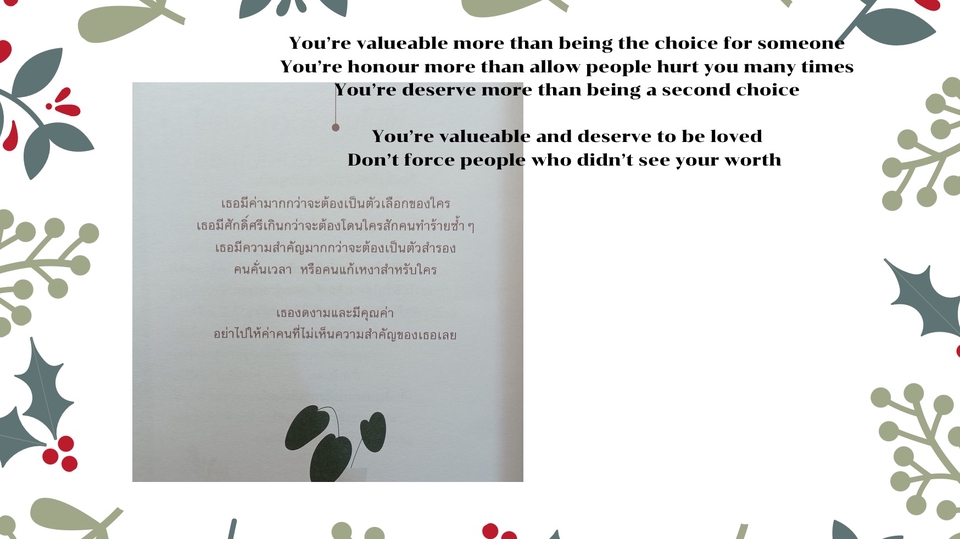 จบการศึกษาภาษาอังกฤษเพื่อการสื่อสารสากล ผลคะแนน TOEIC 475 มีประสบการณ์คุยและประสานงานกับชาวต่างชาติ มีประสบการณ์แปลหนังสือแนวให้กำลังใจ ละมองหาการแปลในรูปแบบอื่นๆเพิ่มขึ้น ขั้นตอนการทำงาน 1. ส่งข้อมูลที่ต้องการให้แปล 2. รอรับข้อมูลที่แปล