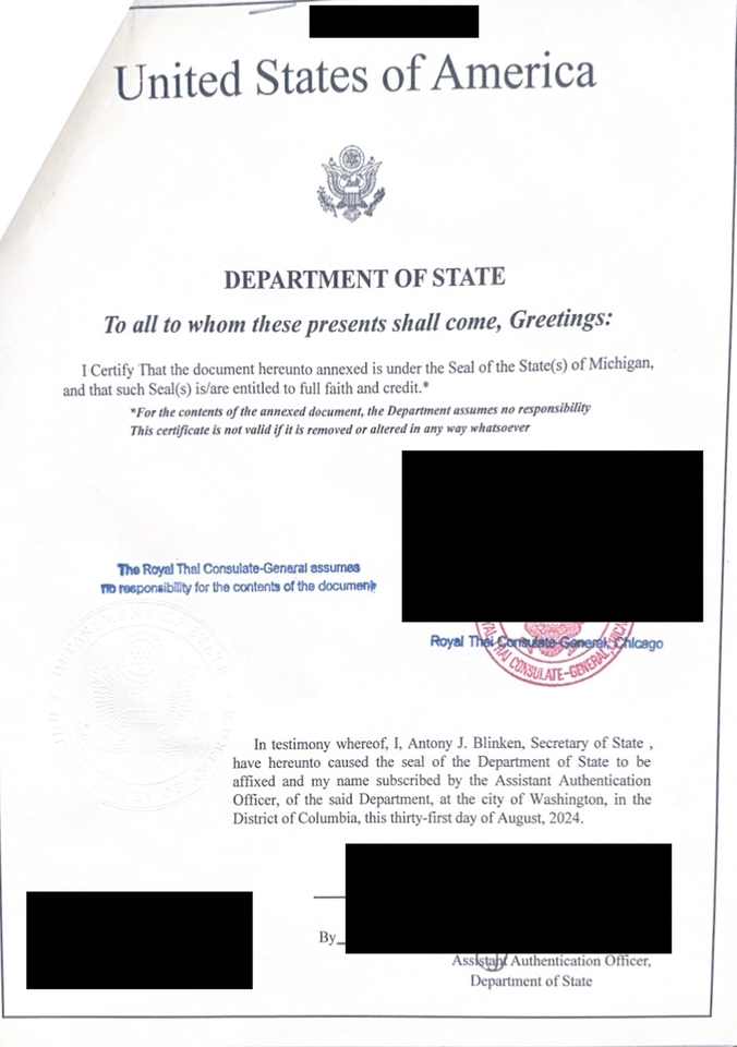 รับดำเนินการรับรองเอกสารที่ออกโดยหน่วยงานของสหรัฐอเมริกา. หรือเรียกว่าการ Legalization ไม่ว่าจะเป็นเอกสาร • ใบทะเบียนสมรสในอเมริกา • ใบ GMP โรงงาน • ใบเกิดที่ในประเทศสหรัฐอเมริกา • เอกสารอื่นๆ ที่ออกโดยหน่วยงานของสหรัฐอเมริกา เหมาะสำหรับเอกสารที่ต้องการนำไปใช้ต่อในประเทศไทย