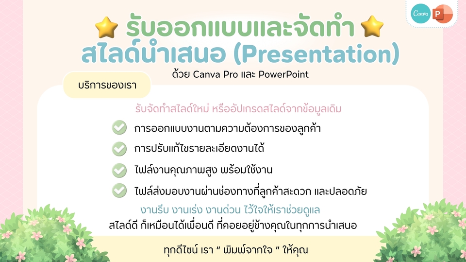 💼 รับออกแบบและจัดทำสไลด์นำเสนอ (Presentation) ด้วย Canva Pro และ Microsoft PowerPoint
