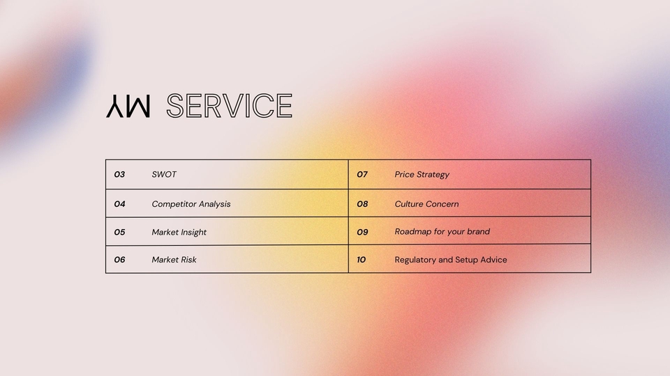 Provides businesses with a strategic roadmap to successfully enter and thrive in global markets. This service includes market research to identify target demographics and cultural insights, competitive analysis, and the development of tailored marketing strategies for different regions. You assist clients in establishing effective distribution channels, optimizing pricing strategies, and creating localized promotional campaigns to resonate with diverse audiences. Additionally, I'll help navigate regulatory considerations and adapt branding to meet international standards. Overall, this service equips businesses with the tools and strategies necessary to expand their reach and achieve sustainable growth in the international marketplace. Strategy First Draft: 2 weeks Duration: 3 months ขั้นตอนการทำงาน 1. Call Discussion to get to know more about your product and service 2. Start 1st Draft 3. Presentation 4. You will get 3 months consultation after the presentation deck 5. Action Plan for clients and if you need setup service there will be an additional cost for this