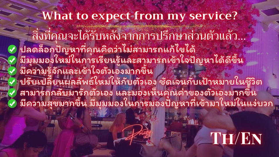 ฿9001) พูดคุยกัน รับฟังเรื่องราวและปัญหาเชิงลึก (deep talk) 2) โทรคุย ระยะเวลา 60 นาที 3) แนะแนวทางในการปลดล็อกปัญหา 4) ปรับแก้ความคิดในเชิงลบ ภาพจำไม่ดีในอดีต 5) แนะแนวทางการรักตัวเองในเชิงบวก พร้อมรับปัญหาใหม่