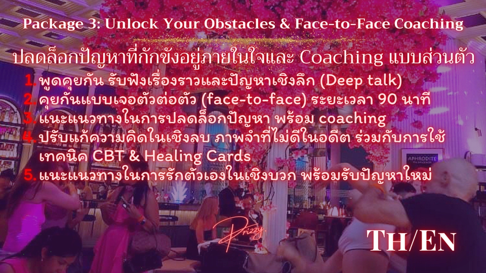 ฿4,2001) พูดคุยกัน รับฟังเรื่องราวและปัญหาเชิงลึก (deep talk) 2) คุยกันแบบเจอตัวต่อตัว (face-to-face) ระยะเวลา 90 นาที 3) แนะแนวทางในการปลดล็อกปัญหา พร้อม coaching 4) ปรับแก้ความคิดในเชิงลบ ภาพจำไม่ดีในอดีต ร่วมกับการใช้เทคนิค CBT & Healing Cards 5) แนะแนวทางการรักตัวเองในเชิงบวก พร้อมรับปัญหาใหม่