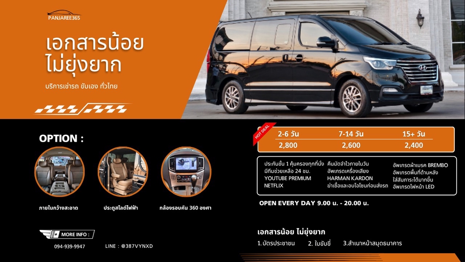 บริการให้เช่ารถ Hyundai H-1 ขับเอง ทั่วไทย ราคาเริ่มต้น 3,400 บาทต่อวัน ติดต่อได้ตลอด 24 ชม. ประกันชั้น 1 ไม่มีค่าความรับผิดชอบส่วนแรก รถเช่าขับเองที่ Option จัดเต็มสุดในตลาดรถเช่า - Youtube Premium - Netfilx - เครื่องเสียง Harman Kardon - ผ้าเบรค Brembo - เบาะหลังพับได้ - ไฟหน้า LED เอกสารน้อย ไม่ยุ่งยาก 1. บัตรประชาชน 2. ใบขับขี่ 3. หน้าสมุดธนาคาร อัตราค่าบริการ 1 วัน = 3,600.-/วัน 2-6 วัน = 3,200.-/วัน 7-15 วัน = 3,000.-/วัน 16-29 วัน = 2,800.-/วัน 30 วันขึ้นไป = 2,500.- /วัน รายเดือน = 75,000.-/เดือน เงื่อนไขการบริการ • มีค่ามัดจำ 4,000.- ( รับคืนทันทีหลังคืนรถ ) • ราคานี้ไม่รวมค่าน้ำมันทางด่วนและที่จอดรถ ขั้นตอนการทำงาน 1. จองคิวล็อควัน 2. เซ็นสัญญา - รับรถ 3. คืนรถ