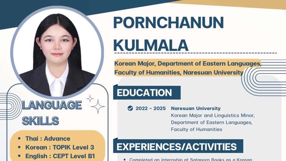 รับทำงานเกี่ยวกับภาษา แปลหนังสือ และการออกแบบคอนเทนท์ มีประสบการณ์ด้านการเป็น tiktok content creator และนักแปล
