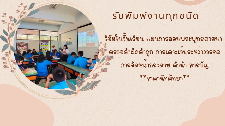 การพิมพ์งานต่างๆ รับตรวจสอบคำผิดในรายงาน การเคาะเว้นระหว่างวรรค จัดหน้ากระดาษ