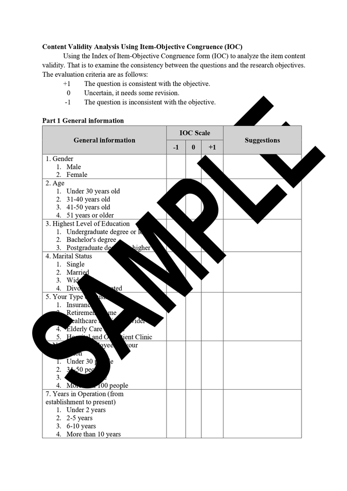 รับทำตาราง IOC ใช้เพื่อตรวจสอบความสอดคล้องระหว่างข้อคำถามกับวัตถุประสงค์ของแบบสอบถามหรือแบบทดสอบ หรือที่เรียกว่า ความตรงเชิงเนื้อหา (Content Validity) เพื่อให้แน่ใจว่าข้อคำถามแต่ละข้อสามารถวัดได้ตรงตามจุดประสงค์ที่ตั้งไว้จริง โดยจะใช้การประเมินจากผู้เชี่ยวชาญและให้ค่าคะแนนที่ระบุว่าสอดคล้อง, ไม่แน่ใจ, หรือไม่สอดคล้อง โดยใช้ข้อมูลจากงานวิจัยของท่านมาจัดเป็น Format ที่เป็นมาตราฐาน (หรือตาม Format ที่ท่านต้องการ) ประกอบไปด้วย ชื่องานวิจัย, ชื่อผู้วิจัย, วัตถุประสงค์ของงานวิจัย, สมมติฐานการวิจัย, และนิยามศัพท์เฉพาะ และนำข้อคำถามของท่านมาจัดเป็นรูปแบบตารางตามตัวแปร รับทำมาแล้วมากกว่า 10 งาน+