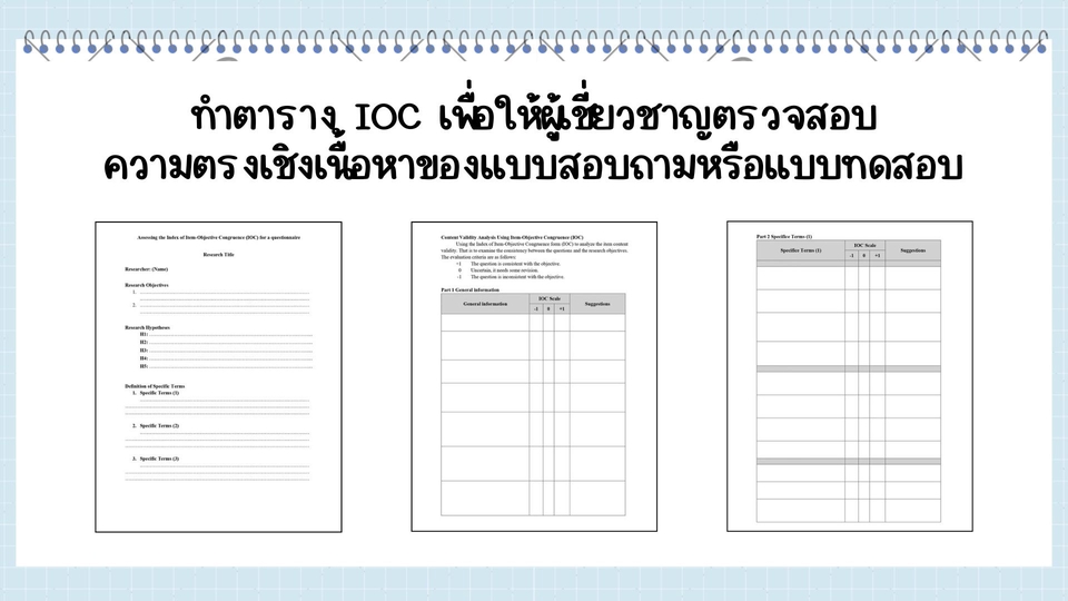 ทำตาราง IOC เพื่อให้ผู้เชี่ยวชาญตรวจสอบความตรงเชิงเนื้อหาของแบบสอบถามหรือแบบทดสอบ (ไทย/อังกฤษ)