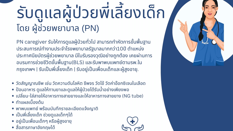 PN caregiver รับให้การดูแลผู้ป่วยทั่วไป สามารถทำหัตการขั้นพื้นฐาน ประสบการณ์ทำงานประจำโรงพยาบาลรัฐบาลมากกว่า10ปี ตำแหน่งประกาศนียบัตรผู้ช่วยพยาบาล มีใบรับรองวุฒิอย่างถูกต้อง เคยผ่านการอบรมการช่วยชีวิตขั้นพื้นฐาน(BLS) และรับพาพบแพทย์ตามรพ.ในกรุงเทพฯ | รับเป็นพี่เลี้ยงเด็ก | รับอยู่เป็นเพื่อนเด็กและผู้สูงอายุ.