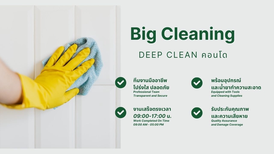 ฿4,999ทีมงาน 3- 4 คน แถมฟรี!! อบโอโซน และดูดไรฝุ่น พร้อมอุปกรณ์และน้ำยาทำความสะอาด ให้บริการเวลา 09.00 น. - 17.00 น. (โดยปกติงานจะเสร็จภายใน 1 วัน) Cleaning Service Housekeeper: 3-4 people Free!! Ozone Sterilization and Dust Mite Removal Includes: Cleaning equipment and cleaning solutions Service Hours: 9:00 AM - 5:00 PM (Typically, the work is completed within one day)