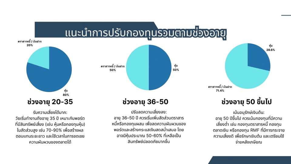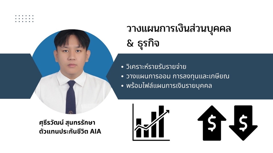 ให้บริการวางแผนทางการเงินส่วนบุคคลและธุรกิจแบบครบวงจร เหมาะสำหรับผู้ที่ต้องการจัดระเบียบการเงิน วางแผนอนาคต หรือเตรียมตัวเกษียณอย่างมั่นคง โดยผมจะช่วยคุณ วิเคราะห์รายรับ-รายจ่าย ตรวจสุขภาพการเงิน พร้อมจัดทำ แผนการออม การลงทุน และภาษี ให้เหมาะกับเป้าหมายชีวิต เช่น เก็บเงินซื้อบ้าน เตรียมทุนการศึกษาบุตร หรือสร้างเงินล้านเพื่อวัยเกษียณ บริการนี้ยังเหมาะกับเจ้าของกิจการที่ต้องการวางแผนการเงินของธุรกิจให้มีประสิทธิภาพมากขึ้น พร้อมคำแนะนำการลงทุนเบื้องต้นอย่างเข้าใจง่ายตามระดับความเสี่ยงของคุณ ไม่ว่าคุณจะเพิ่งเริ่มต้น หรือมีพื้นฐานอยู่แล้ว ผมจะออกแบบแผนเฉพาะบุคคลให้สอดคล้องกับไลฟ์สไตล์และรายได้ของคุณ ขั้นตอนการทำงาน 1. รับข้อมูลเบื้องต้นจากลูกค้า อายุ, รายได้, รายจ่าย, ภาระหนี้สิน, สินทรัพย์ปัจจุบัน เป้าหมายทางการเงิน (เช่น เกษียณ, ซื้อบ้าน, การศึกษาบุตร ฯลฯ) ความเสี่ยงที่รับได้ และระยะเวลาลงทุน 2. วิเคราะห์ข้อมูลและวางแผนเบื้องต้น ประเมินฐานะการเงิน (Cash Flow, Net Worth, Debt Ratio) วิเคราะห์เป้าหมาย และประเมินความเป็นไปได้ คำนวณการออม-การลงทุนที่เหมาะสม พร้อมใช้หลักการคณิตศาสตร์ประกันภัยเพื่อเสริมความแม่นยำ 3. จัดทำแผนการเงินเฉพาะบุคคล วางพอร์ตการลงทุนตามช่วงอายุและความเสี่ยง แนะนำการออมและกระจายการลงทุน (กองทุนรวม, ประกันชีวิต ฯลฯ) อธิบายแนวทางปรับพอร์ตระยะยาว และการบริหารความเสี่ยง 4. ส่งมอบแผนงานในรูปแบบไฟล์ PDF พร้อมคำอธิบายเข้าใจง่าย และหากลูกค้าต้องการ ปรึกษาเพิ่มเติมแบบ 1 ต่อ 1 ผ่านแชท (ตามแพ็กเกจ) 5. บริการปรับแก้แผน 1 ครั้ง (ถ้ามี) ภายใน 7 วันหลังส่งงาน หากข้อมูลมีการเปลี่ยนแปลง