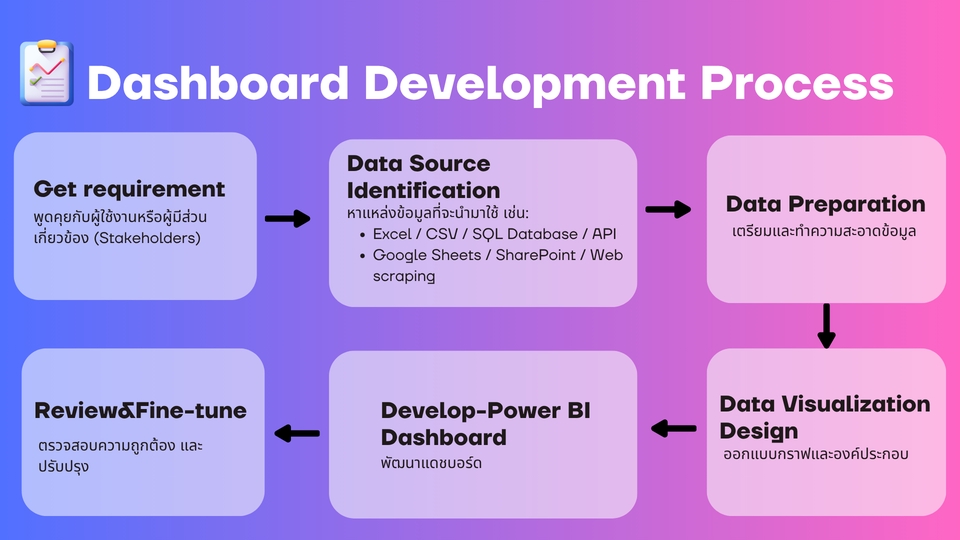 - Basic Dashboard ใช้ Excel หรือ CSV / แสดงกราฟ 3–5 ชิ้น / ไม่มีระบบ refresh อัตโนมัติ 1,500 – 3,000 บาท - Standard Dashboard มีการทำ Data Clean / ใช้ Power Query / 5–10 กราฟ + Slicer 3,000 – 6,000 บาท - Advanced Dashboard เชื่อมต่อฐานข้อมูล / เขียนสูตร DAX / RLS / UX สวย 6,000 – 12,000+ บาท