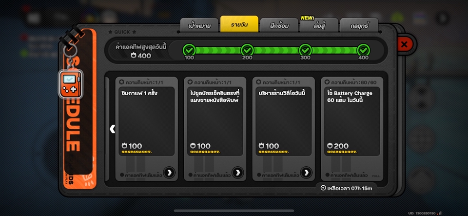฿200GI: เควสประจำวัน 4 เควส ส่งงานที่ NPC Katheryne ZZZ: ค่าแอคทีฟรายวัน 400 คะแนน (ล็อคอิน ขูดบัตร ชิมการแฟ บริหารร้าน)