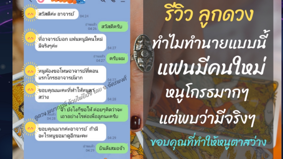 รับดูดวง ไพ่ยิปซี และ ไพ่ทำดีสมหวัง แบบเจาะคำถาม โดยมีแพ็คเก็จดังนี้ ** แบบพิมพ์ถาม (พร้อมถ่ายรูปไพ่ที่เปิดให้ดูทุกคำถาม) - ดูดวงแบบ 3 คำถาม 199.- - ดูดวงแบบ 5 คำถาม 299.- - ดูดวงแบบ 7 คำถาม 399.- ------------------------ **หรือ จะเลือก แบบการโทร ผ่าน App Fastwork (ไม่จำกัดคำถาม ถามได้เรื่อยๆจนกว่าจะครบเวลา แต่จะไม่เห็นไพ่ที่เปิด) - ประมาณ 10 นาที 199 .- (แบบ 10 นาที มันเร็วมาก เหมาะกับการอยากจะทดลองดู) - ประมาณ 20 นาที 299 .- - ประมาณ 30 นาที 399 .- (1). ลักษณะการดูดวง จะเป็นการตั้งคำถามมา และ เปิดไพ่ ตอบกลับไป ในแต่ละคำถาม (หมอดูจะเป็นผู้เปิดให้) หากรู้สึกว่ายังไม่ชัดเจน ขอให้เปิดขยายให้ได้ >> ตามสมควร (2.). การดูไพ่ในช่วงนี้ จะสะดวกดูผ่านทาง inbox (เห็นหน้าไพ่) และ แบบโทรผ่าน App Fastwork (ไม่เห็นหน้าไพ่) (3). ความแม่นยำ อยู่ที่ตอนตั้งคำถาม ควรแจ้งรายละเอียดมาให้ชัดเจนว่าจะถามอะไร เช่น เรื่องความรักควรบอก สถานะว่า เป็น สามี หรือ แฟน หรือ คนคุย หรือ คนที่ แอบชอบ เป็นต้น ข้อดี : ของการดูผ่านแชทใน Inbox คุณลูกดวงไม่ต้องจด และจะกลับมาอ่านซ้ำยังไงก็ได้ หมายเหตุ : ไม่รับดูเรื่อง การจะเกิด (เรื่องท้อง), เพศเด็ก, คนนี้จะเสียชีวิตหรือไม่, ของหาย,เนื้อคู่ ขั้นตอนการทำงาน 1. ลูกดวงจ่ายค่าดูดวง ตามแพ็คเก็จที่เลือกในใบเสนอราคา 2. เมื่อโอนเงินเรียบร้อย ก็เริ่มดูดวงตามที่ได้ตกลงกัน 3. การดูดวงแบบพิมพ์ ท่านจะได้รับ คำทำนาย และ ถ่ายรูปหน้าไพ่ ส่งไปในแชท 4. การดูดวงแบบโทร โทรผ่านแอป Fastwork จะไม่ได้รับหน้าไพ่ 5. เมื่อจบการดูดวง รอรับลิงค์อนุมัติงาน เพื่อทำการจบงานแบบสมบูรณ์