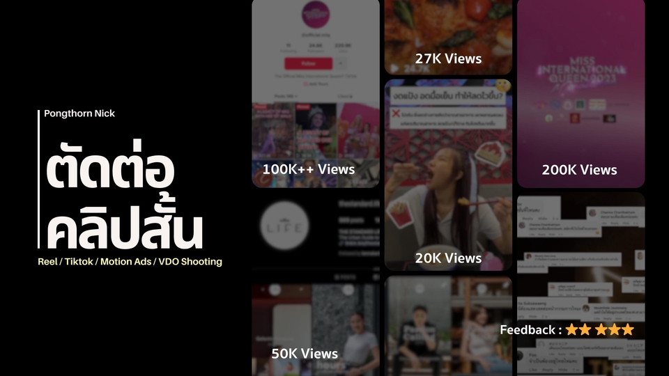 สวัสดีครับ นิคเป็น editor ที่ถนัดงานตัดต่อคลิป Reels IG , Tiktok , คลิปรีวิวสินค้า ความยาวไม่เกิน 2 นาที (สามารถถ่ายงานเองได้เช่นกัน มี style, หรูหรา, น่าสนใจ) 🤩ปัจจุบันตัดคลิปให้ลูกค้าที่น่าเชื่อถือหลายเจ้า เช่น The Standard, MIQ, Dr.Jill, TheBlackSea เป็นต้น สามารถดูผลงานบางส่วนที่ผ่านๆมาได้ที่ link : https://drive.google.com/drive/folders/1rezpaamD-7I4EZjCyJLGE_qiijOeJVBf?usp=share_link สอบถามข้อมูลเพิ่มเติมหรือปรึกษาขอคำแนะนำได้ตลอด ทักแชท Fastwork ได้เลยครับ ยินดีครับ 🙇🏻♂️✨ แชท! - พูดคุยเบื้องต้น เพื่อทำความเข้าใจรูปแบบงานที่ลูกค้าต้องการ บรีฟ! - ลูกค้าเตรียมภาพในหัว Silde & Reference เพื่อให้เข้าใจตรงกัน เตรียม! - ลูกค้าเตรียม Footage ภาพและคลิปวีดีโอต่าง ๆ ส่งผ่านทาง Google Drive เริ่ม! - ตัดงาน Draft แรกส่งให้ลูกค้ารีวิว แก้! - แก้ไข draft 2 / 3 ตาม feedback ของลูกค้า จบ! - จบงาน ส่งไฟล์ final ให้กับลูกค้าและ Backup ต่างๆ