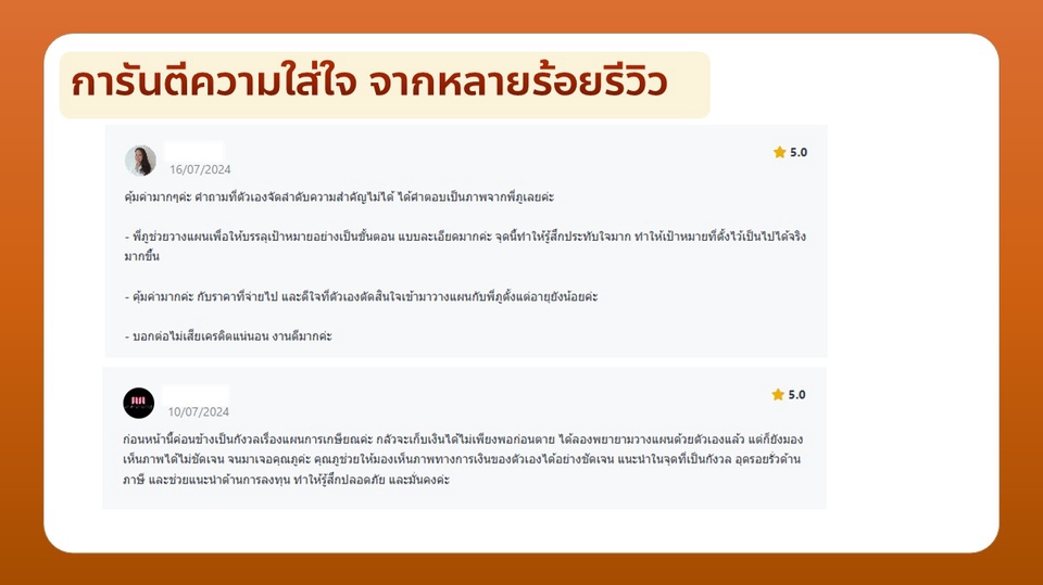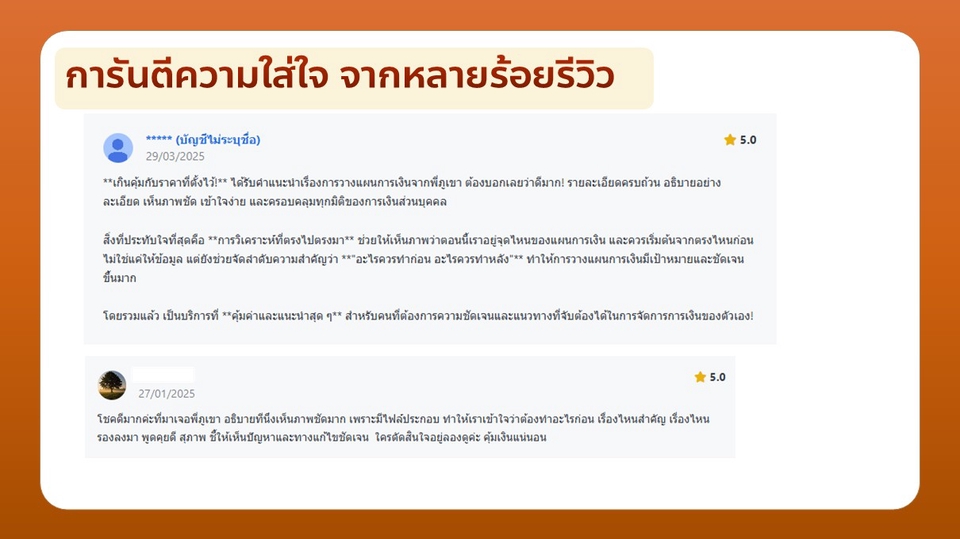 ฿1,000เหมาะกับคนที่อยากจะ Reset การเงินให้ชัดเจน และ Restart ให้เป็นระบบ หากคุณมี 😅พอร์ทการลงทุนที่สะเปะสะปะ ไม่รู้ว่าที่ลงทุนอยู่นั้นดีไหม 😅มีประกันหลายเล่ม ไม่รู้ว่าทำอะไรได้บ้าง 😅อยากจะปรับทุกอย่างให้ลีน เข้าใจง่าย ติดตามง่าย ตอบโจทย์ชีวิตมากขึ้น บริการนี้จะช่วยคุณได้ คุณลูกค้าจะได้: ✅ การวิเคราะห์พอร์ตลงทุนและประกันที่มีอยู่ ✅ ปรับทุกอย่างให้เข้าใจง่าย ลีน ไม่ซ้ำซ้อน ✅ แนะนำการจัดการที่ตอบโจทย์เป้าหมายชีวิตได้จริง