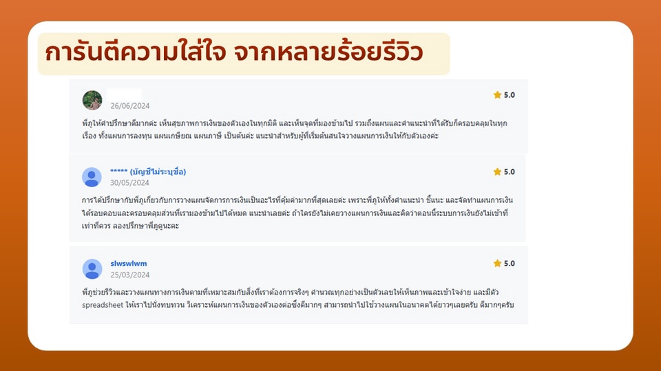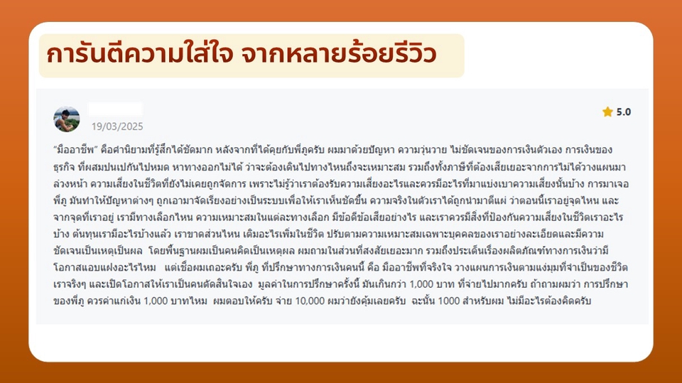 ฿1,000เหมาะกับคนทั่วไปที่อยากจะเริ่มวางแผนการเงิน หากคุณรู้สึก 😅 อยากจัดการเรื่องเงินให้ดีขึ้น 😅 อยากเริ่มลงทุน 😅 อยากวางแผนเกษียณ จะเริ่มอย่างไร? เริ่มตอนนี้ทันมั้ย? 😅 ไม่รู้จะซื้อประกันอะไรให้เหมาะกับตัวเอง หรือที่มีอยู่ดีพอมั้ย? 😅 อยากลดหย่อนภาษี 😅 อยากวางแผนการศึกษาให้บุตร บริการนี้จะช่วยคุณได้ คุณลูกค้าจะได้: ✅ การจัดระเบียบชีวิตการเงิน / รายรับรายจ่าย ✅ การออม / การจัดพอร์ตการลงทุน / แผนเกษียณ ✅ การจัดการ ลดหย่อนภาษี / ประกัน / มรดก ✅ แผนการซื้อ บ้าน รถ การศึกษาลูก และเป้าหมายอื่นๆ