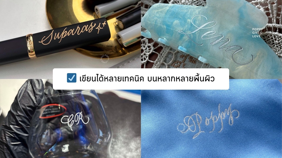 :: รับเขียน Calligraphy หรือ อักษรวิจิตร เป็น ภาษาไทย และภาษาอังกฤษ โดยเป็นการเขียนด้วยมือทั้งหมด :: สามารถเขียนบนกระดาษ การ์ด เขียนชื่อบนซองงานแต่งงาน เขียนการ์ดเชิญ การ์ดอวยพร การ์ดครบรอบ ปกสมุด เขียนใส่กระดาษเพื่อนำไปใส่กรอบรูปเป็นของขวัญ :: สามารถเขียนและแกะสลักบนหลากหลายพื้นผิว ไม่ว่าจะเป็นกระดาษ แก้ว ผ้า พลาสติก เหล็ก และอื่นๆ :: รับเขียนและแกะสลักนอกสถานที่ พื้นที่กรุงเทพและปริมณฑล สำหรับพื้นที่อื่น มีค่าใช้จ่ายเพิ่มเติม :: แบรนด์ที่เคยร่วมงาน: BOTTEGA VENETA BURBERRY ESTĒE LAUDER Dolce&Gabbana ISSEY MIYAKE LA MER L'Oréal Paris MERGE MONTBLANC POLA รวมถึงออแกไนเซอร์ PR Agency และคู่แต่งงานอีกหลายคู่ :: เป้มีประสบการณ์เขียน Calligraphy มากว่า 5 ปี ตั้งใจและใส่ใจกับผลงานทุกชิ้น เพื่อสร้างประสบการณ์ที่น่าจดจำแก่ผู้รับ ยินดีให้บริการลูกค้าทั้งรายย่อย บริษัทขนาดเล็ก จนถึงองค์กรขนาดใหญ่ค่ะ สนใจสอบถามก่อนได้ค่า :) :: ขั้นตอนการทำงาน 1. ลูกค้าแจ้งรายละเอียดที่ต้องการ พร้อม reference (รูปอ้างอิง หากมี) 2. ทางร้านพิจารณารายละเอียด ประเมินและส่งใบเสนอราคา 3. ลูกค้าโอนเงินผ่านระบบ 4. ทางร้านเริ่มดำเนินการเขียน หรือ ออกแบบ 5. (สำหรับงานออกแบบ) ทางร้านส่งแบบร่างแรกให้ลูกค้าคอมเมนท์ 6. (สำหรับงานออกแบบ) ปรังปรุงแก้ไขชิ้นงานตามที่ตกลงกัน 7. ส่งงานให้ลูกค้า บริการเขียน Calligraphy, รับเขียน Calligraphy ภาษาไทย, รับจ้างเขียนอักษรวิจิตร, นักเขียน Calligraphy กรุงเทพ, ตัวเขียน Calligraphy, อักษรวิจิตร, คัดลายมือ, สลักแก้วไวน์, สลักขวดไวน์, สลักน้ำหอม, สลักลิปสติก, สลักแก้วเก็บความเย็น, ของขวัญให้เพื่อนเจ้าสาว