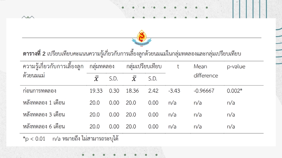 รับวิเคราะห์ข้อมูลทางสถิติด้วยโปรแกรม SPSS และ MS Excel ทั้งงานวิจัยด้านการแพทย์และสาธารณสุข และด้านสังคมศาสตร์ - สถิติเชิงพรรณนา เช่น ความถี่ ร้อยละ ส่วนเบี่ยงเบนมาตรฐาน ค่าเฉลี่ย - สถิติเชิงอนุมาน เช่น Independent t-test, Paired t-test, Chi-square test, One-Way ANOVA, Pearson correlation ขั้นตอนการทำงาน 1. ลูกค้าอธิบายรายละเอียดงาน วัตถุประสงค์ ลักษณะข้อมูลที่ต้องการวิเคราะห์ 2. ลูกค้าส่งไฟล์ข้อมูลดิบในรูปแบบ MS Excel หรือ SPSS เท่านั้น 3. วิเคราะห์ข้อมูลประมาณ 3-5 วัน ขึ้นกับความยากง่ายของสถิติ จำนวนตัวอย่าง และจำนวนตัวแปรที่ต้องการวิเคราะห์ ความพร้อมของข้อมูลจากไฟล์ที่ลูกค้าส่งมา 4. ส่งผลการวิเคราะห์ในรูปแบบ MS Word/ MS Excel/ SPSS หรือตามที่ตกลงกันไว้ 5. ลูกค้าตรวจสอบผลการวิเคราะห์ หากมีแก้ไข สามารถแก้ไขได้ 1 ครั้ง