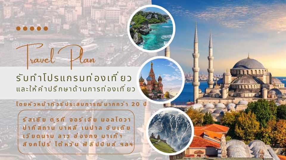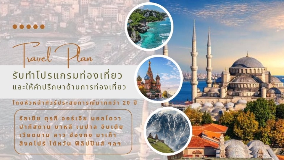 รับทำโปรแกรมท่องเที่ยว แพลนท่องเที่ยว ทั้งภาษาไทยและภาษาอังกฤษ โดยหัวหน้าทัวร์ที่มีประสบการณ์มากกว่า 20 ปี รวมถึงการปรึกษาด้านอื่นๆ สำหรับการท่องเที่ยวด้วย ขั้นตอนการทำงาน 1. แจ้งรายละเอียดของงาน ว่าต้องการแบบใด เดินทางไปไหนบ้างคร่าวๆ 2. ส่งโปรแกรมให้ดู เพื่อให้ผู้จ้างงานแก้ไข ตามความต้องการ และทางเราจะส่งโปรแกรมที่แก้ไขแล้วไปให้