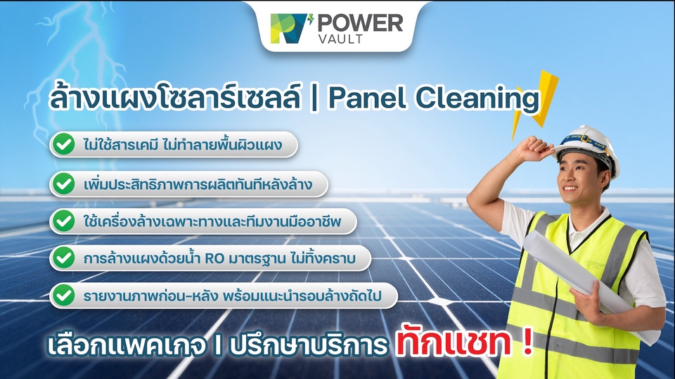 เพื่อให้การลงทุนในพลังงานแสงอาทิตย์ของคุณ ให้ผลตอบแทนอย่างเต็มประสิทธิภาพ PowerVault ขอเสนอแพคเกจบริการดูแลและตรวจสอบระบบโซลาร์เซลล์อย่างมืออาชีพ ที่ครอบคลุมตั้งแต่การทำความสะอาด ตรวจสอบ ไปจนถึงการมอนิเตอร์ระบบแบบเรียลไทม์ บริการดูแลพื้นฐานทั้งสำหรับผู้เริ่มต้นใช้งานระบบโซลาร์เซลล์ ระบบโซลาร์เซลล์ขนาดเล็กหรืออยู่ในพื้นที่ที่สภาพแวดล้อมไม่ส่งผลกระทบต่อการผลิตไฟฟ้ามากนัก, สำหรับโรงงาน อาคารพาณิชย์ ไปจนนถึงระบบขนาดใหญ่ โรงงานอุตสาหกรรม หรือผู้ประกอบการที่ต้องการบริหารต้นทุน ⭐️พร้อมบริการเสริม : Inspection – ตรวจสอบระบบอย่างละเอียด ด้วยมาตรฐานวิศวกรรมระดับสูง Monitoring – บริการติดตามสถานะระบบแบบเรียลไทม์ พร้อมทีมวิศวกรดูแล 24/7