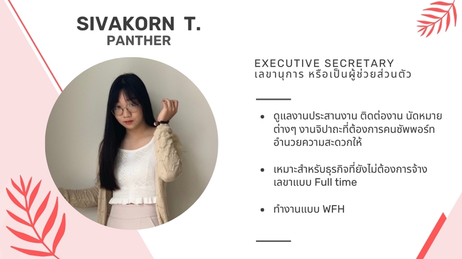 ผู้ช่วยส่วนตัว หรือ เลขานุการ มุ่งเน้นไปทางการช่วยเหลือ เสริมทำงานให้ในสิ่งที่ขาด สำหรับธุรกิจที่ยังไม่ต้องการจ้างเลขาแบบ Full time 🚩 ช่วยสนับสนุน ให้งานสำเร็จลุล่วงไปได้อย่างราบรื่น รวดเร็วทันเวลา 🚩 งานจิปาถะ ที่ต้องการคนช่วยทำให้ เช่น จองโรงแรม จองตั๋วเครื่องบิน วางแผนการเดินทาง จองร้านอาหาร จองกอล์ฟ ซื้อของฝาก/ของขวัญ และงานอื่นๆที่เป็นงานซัพพอร์ทเจ้านาย 🚩 ช่วยอำนวยความสะดวก ในด้านต่างๆ การทำรายงาน Research แปลภาษา(TH/EN) Presentation 🚩 ช่วยประสานงาน 🚩 ที่ปรึกษาการทำธุรกิจ ผู้ช่วยด้านธุรกิจ ❗❗ เนื่องจากทำเป็นฟรีแลนซ์(WFH) จะไม่สามารถออกไปพบ/ปฏิบัติงานนอกสถานที่ใน*เวลากลางวัน*ได้ สามารถออกไปปฏิบัติงานได้หลัง 17.00 น. เป็นต้นไป เช่น ให้ซื้อของขวัญหรือส่งพัสดุไปรษณีย์ ❗❗ ค่าจ้างงานนั้นยังไม่รวมค่าใช้จ่ายจากการปฏิบัติงาน เช่น ค่ารถ ค่าส่งพัสดุ ค่าซื้อของขวัญ จองโรงแรม/ตั๋ว 👍ประสบการณ์ที่ผ่านมา👍 - Executive Secretary - Online Marketing การทำการตลาดบน E-Commerce; LAZADA/SHOPEE/EVEANDBOY/KONVY/BEAUTRIUM/LOFT/POMELO - Business Development: มีประสบการณ์ด้านการทำแผนการตลาดสำหรับธุรกิจ และแผนการขาย - สามารถออกแบบ/จัดทำ Artwork - Canva ได้ (มีค่าใช้จ่ายเพิ่มเติม) ขั้นตอนการทำงาน 1. แจ้งเรื่องที่ต้องการให้ช่วยซัพพอร์ท บรีฟงาน รับรายละเอียดงานจากลูกค้า -ต้องการวันไหน เร่งด่วนหรือไม่ -ตัวอย่าง(ถ้ามี) สามารถส่งเนื้อหางานมาให้พิจารณาเวลาจัดทำก่อนได้เลยค่ะ 2. ตอบกลับลูกค้าว่าสามารถปฏิบัติได้ตามกรอบเวลา และขอบเขตงานหรือไม่ ถ้าได้ทำการจัดจ้าง 3. ทำงานตามได้รับมอบหมาย ตามเนื้องาน หากเป็นงานเอกสารหรือออกแบบ สามารถแก้ไขได้ 3 ครั้ง / หากเป็นงานทั่วไปจะแจ้งอัพเดทขั้นตอนการทำงานให้ทุกวัน อย่างน้อยวันละครั้ง หรือมากกว่านั้น 4. ตรวจสอบความเรียบร้อยของงาน 5. ส่งงานให้ลูกค้าตรวจว่าถูกต้องและตรงตามความต้องการหรือไม่ 6. กรณีเป็นงานซัพพอร์ทจะอัพเดทความสำเร็จของงาน / กรณีเป็นงานเอกสาร จะส่งไฟล์ไฟนอลเพื่อปิดงาน