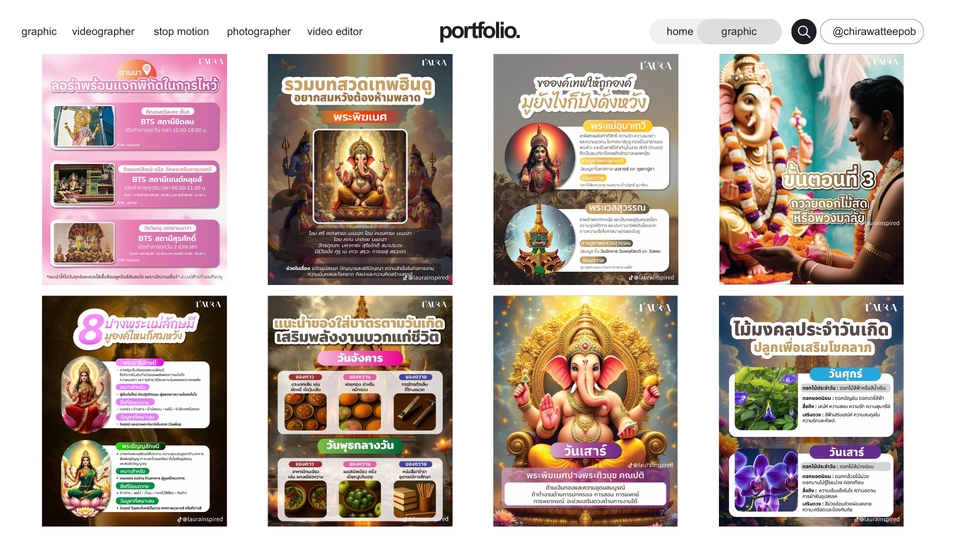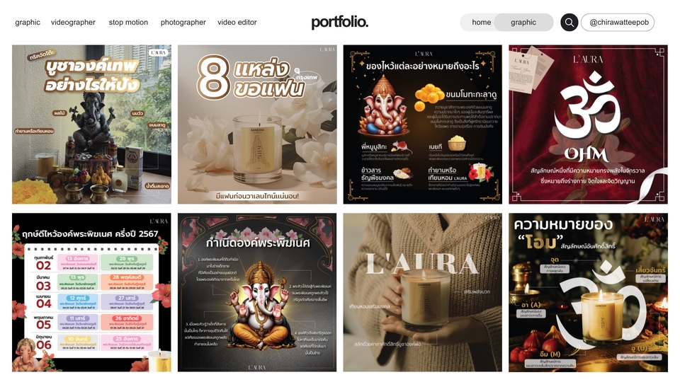 รายละเอียดงานออกแบบ: แบรนด์ LAURA ประเภทงาน: ออกแบบกราฟิกเพื่อสื่อสารแบรนด์และสร้างคอนเทนต์บนโซเชียลมีเดีย กลุ่มเป้าหมาย: ผู้ที่ชื่อชอบและหลงใหลในกลิ่นของดอกไม้หอมๆเเละผู้ที่นับถือองค์เทพต่างๆ คอนเซ็ปต์การออกแบบ: เน้นการเข้าถึงง่าย เเละให้ความรู้เกี่ยวกับสถานที่ วันที่ เเละทริคในการไหว้บูชาต่างๆ รวมถึงยังใช้โทนสีที่ดูหลากหลายให้เข้ากับเรื่องที่จะสื่อ องค์ประกอบภาพ เช่น องค์พระพิฆเนศ ดอกชบาเเดงที่องค์ท่านโปรดปราน เทียนหอม เเละสถานที่บูชาต่างๆในไทย องค์ประกอบหลักของงาน: โลโก้และแบรนดิ้ง: ใช้ฟอนต์ทันสมัย เรียบหรู เพื่อสร้างเอกลักษณ์ของแบรนด์ เนื้อหาบนแบนเนอร์: มีทั้งภาพโปรโมชัน, ฤกษ์ดีในการบูชา , ทริคในการขอพร, คำถามที่พบบ่อย (Q&A) และ เพื่อครอบคลุมทุกประเด็นที่ลูกค้าอยากรู้ รูปแบบภาพ: จัดวางแบบ grid ให้ต่อเนื่องเป็นชุด ช่วยเสริมภาพลักษณ์แบรนด์ให้ดูเป็นมืออาชีพและน่าติดตาม คอนเทนต์ภาพถ่ายสินค้า: มีการจัดวางสินค้าในสภาพแวดล้อมที่สะอาด ทันสมัย เพื่อเน้นคุณภาพของผลิตภัณฑ์ เป้าหมายของงานออกแบบ: สื่อสารคุณสมบัติของผลิตภัณฑ์อย่างชัดเจน สร้างความเชื่อมั่นให้ลูกค้า กระตุ้นยอดขายผ่านภาพลักษณ์แบรนด์ที่น่าเชื่อถือและเข้าถึงง่าย