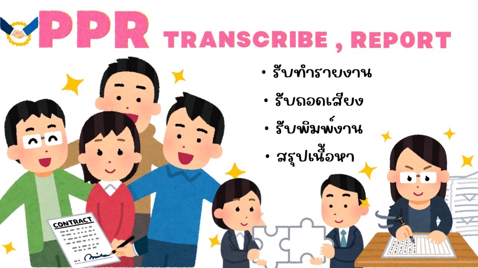 บริการรับทำรายงาน / พิมพ์งาน / ถอดเทป / สรุปเนื้อหา โดยทีม PPR Transcribe & Report เราคือทีมผู้เชี่ยวชาญที่ให้บริการจัดทำเอกสารครบวงจร พร้อมส่งงานตรงเวลา และใส่ใจในทุกรายละเอียด ✅ บริการของเรา • รับทำรายงานทุกประเภท (วิชาการ, สรุปเนื้อหา, เชิงวิเคราะห์ ฯลฯ) • พิมพ์รายงานจากไฟล์เสียงหรือคลิปวิดีโอ (ถอดเทปพร้อมเรียบเรียง) • สรุปเนื้อหาจากหนังสือ บทความ งานวิจัย หรือคลิป YouTube / Zoom • ถอดเสียงสัมภาษณ์ ประชุม สัมมนา และเรียบเรียงเป็นรูปแบบรายงาน • พิมพ์งานทั่วไป / พิมพ์เอกสารราชการ 💬 จุดเด่นของเรา • ทีมงานประสบการณ์จริงด้านภาษาและงานเอกสาร • ตรวจสอบความถูกต้องก่อนส่งทุกชิ้น • ส่งงานตรงเวลา พูดคุยง่าย ปรับแก้งานได้ตามตกลง • รับงานด่วน (มีค่าบริการเพิ่มเติม) ราคาขึ้นอยู่กับความยาวไฟล์และรายละเอียดงาน (สอบถามก่อนเสนอราคา) ⸻ 📩 ส่งไฟล์ / แจ้งรายละเอียดได้เลย: • ประเภทงานที่ต้องการ • ไฟล์เสียง/วิดีโอ/เอกสารประกอบ • วันเวลาที่ต้องการรับงาน