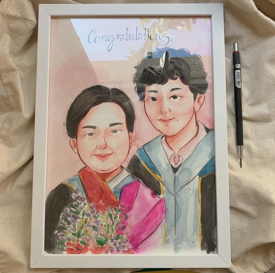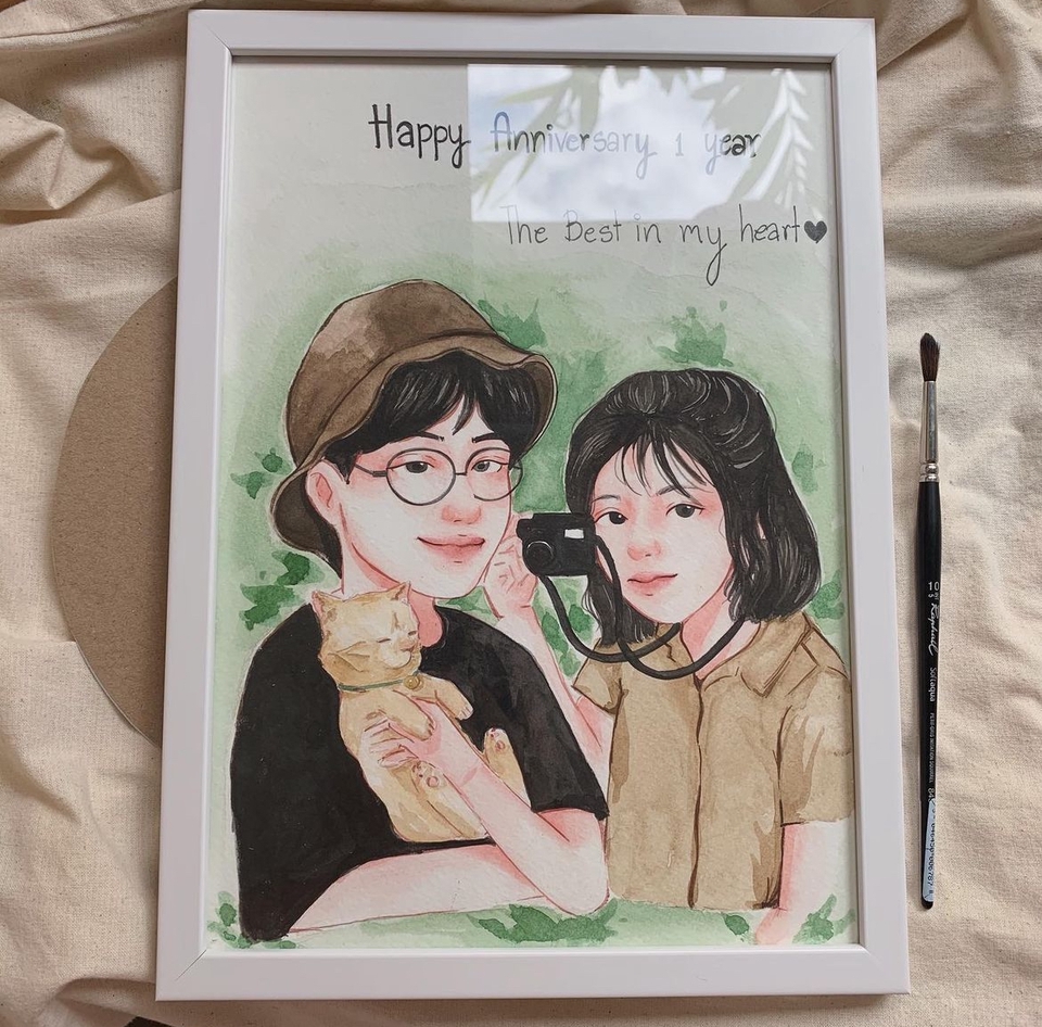 งานวาดภาพสีน้ำ ในกระดาษ มีขนาด A6,A5,A4 เป็นการใช้เทคนิคสีน้ำ วาดตามภาพถ่ายจริง หรือ ภาพที่ออกแบบโดยคุณลูกค้า มี2ลายเส้น คือ ลายเส้นการ์ตูน(หัวโต น่ารัก) และลายเส้นกึ่งเหมือน (แนวคล้าย แต่ไม่เหมือนเป๊ะ เป็นลายเส้นของทางร้าน) สามารถนำไปสะสม หรือ ให้เป็นของขวัญได้ค่ะ ส่งงานจริงให้ลูกค้าค่ะ ขั้นตอนการทำงาน 1. ส่งแบบร่าง 2. ส่งแบบลงสีเสร็จสมบูรณ์ 3. ส่งสินค้าให้ถึงมือลูกค้า