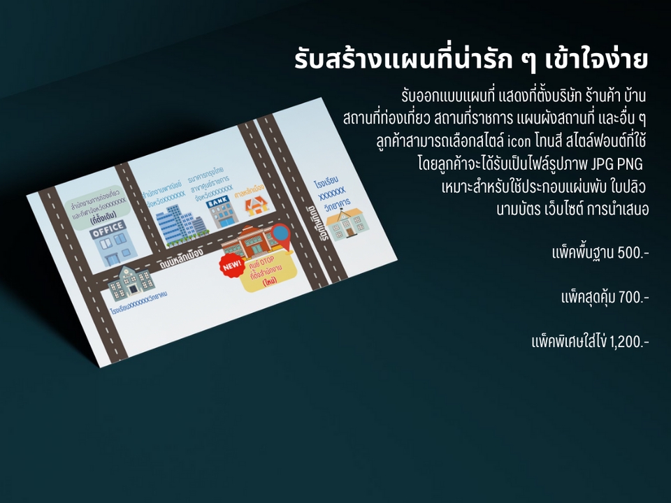 รับออกแบบแผนที่ แสดงที่ตั้งบริษัท ร้านค้า บ้าน สถานที่ท่องเที่ยว สถานที่ราชการ แผนผังสถานที่ และอื่น ๆ ลูกค้าสามารถเลือกสไตล์ icon โทนสี สไตล์ฟอนต์ที่ใช้ โดยลูกค้าจะได้รับเป็นไฟล์รูปภาพ JPG เหมาะสำหรับใช้ประกอบแผ่นพับ ใบปลิว นามบัตร เว็บไซต์ การนำเสนอ ขั้นตอนการทำงาน 1. ตกลงรายละเอียด : แนวตั้ง/แนวนอน วัตถุประสงค์ที่นำไปใช้ (เพื่อเลือกขนาดไฟล์ให้เหมาะสม) แบบในใจ โทนสี ICON ภาพร่าง สไตล์ที่ต้องการ 2. แผนที่ต้นฉบับ : คุณลูกค้าส่งแผนที่ต้นฉบับที่ต้องการทำ รายละเอียด หรือ google map ที่ต้องการ 3. ส่งภาพร่าง : ร้านจะส่ง layout ชิ้นงานคร่าว ๆ พาเลทสีที่จะใช้ในงาน ให้คุณลูกค้าคอนเฟิร์ม 4. ทางร้านจัดทำชิ้นงานฉบับจริง 5. แก้ไขชิ้นงาน : สามารถแก้ไขได้ 2-3 ครั้ง ตามแพ็คเกตที่คุณลูกค้าเลือก การแก้ไขกรุณาระบุให้ชัดเจน