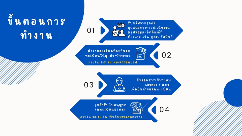 บริการรับจดทะเบียน อย ผลิตภัณฑ์อาหาร อาหารสัตว์เลี้ยง โดยมีประสบการณ์การจดทะเบียนมากกว่า 3 ปีขึ้นไป ให้คำปรึกษาและแนะนำเกี่ยวกับเอกสารที่ต้องใช้ประกอบการยื่น ผลิต/นำเข้า และให้คำปรึกษาเกี่ยวกับผลิตภัณฑ์อาหาร ขั้นตอนการทำงาน 1. รับบรีฟจากลูกค้า คุยแนวทางการดำ เนินงาน สรุปข้อมูลผลิตภัณฑ์ที่ ต้องการ เช่น สูตร, ชื่อสินค้า 2. ส่งรายละเอียดที่จะยื่นจด ทะเบียนให้ลูกค้าrพิจารณา 3. ยื่นเอกสารเข้าระบบ Skynet / สสจ เพื่อยื่นคำ ขอจดทะเบียน ลูกค้ารับใบอนุญาต จดทะเบียนอาหาร 4. ลูกค้ารับใบอนุญาต จดทะเบียนอาหาร
