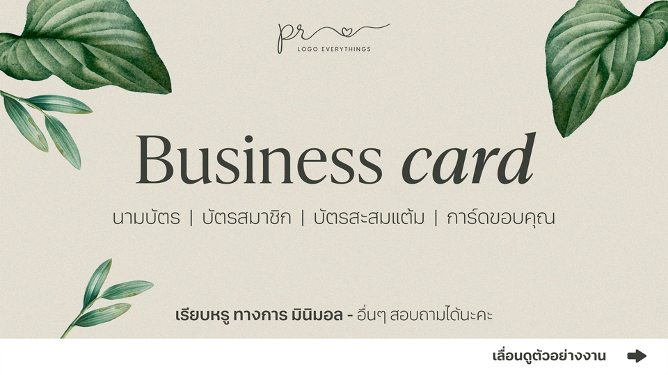 ออกแบบนามบัตร - บัตรสมาชิก - บัตรสะสมแต้ม - การ์ขอบคุณ - ใบรับประกัน - เรียบหรู ทางการ มินิมอล น่ารัก เป็นมิตร หรืออื่นๆ สามารถสอบถามได้นะคะ "รวมไฟล์ต้นฉบับ (.Ai) พร้อมส่งโรงพิมพ์" สนใจแจ้งรายละเอียด หรือมีข้อสงสัยอะไร สามารถทักแชทมาพูดคุยได้เลยนะคะ :) -------------------------------------------- ขั้นตอนการทำงาน 1. แจ้งรายละเอียดงาน 2. คุยข้อตกลง และเสนอราคา 3. ใช้เวลาทำงาน 2 วันหลังชำระค่าบริการ*ไม่รวมวันอาทิตย์ 4. ส่งงานให้เลือก/ แก้ไขงานได้ 3 ครั้ง (ยืดหยุ่นได้) 5. ส่งงาน final (ไฟล์ Ai, Pdf และ Jpeg)