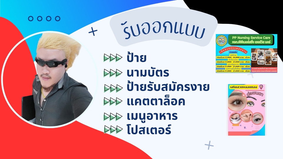 ออกแบบได้ตามโทนสี ที่ลูกค้าต้องการทั้ง นามบัตร แคคตาล็อคสินค้า ป้าย ป้ายรับสมัครงาน โบชัวร์ ใบปลิว เมนูอาหารขนมเครื่องดื่ม โปสเตอร์ ป้ายไวนิล ป้ายโฆษณา ป้ายร้าน ขั้นตอนการทำงาน 1. โปรแกรมAI 2. โปรแกรม canva