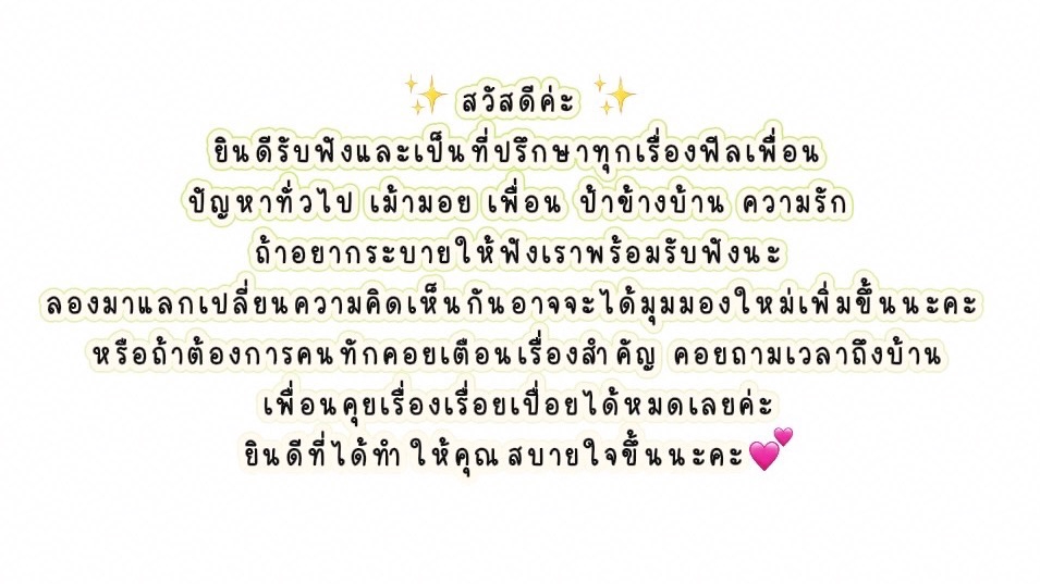ยินดีรับฟังและเป็นที่ปรึกษาฟิลเพื่อนนะคะ มีความรับผิดชอบและทำงานเต็มที่ ทุกอย่างที่คุยกันจะเป็นความลับ เป็นกันสามารถพูดคุยตกลงกันได้ค่ะ