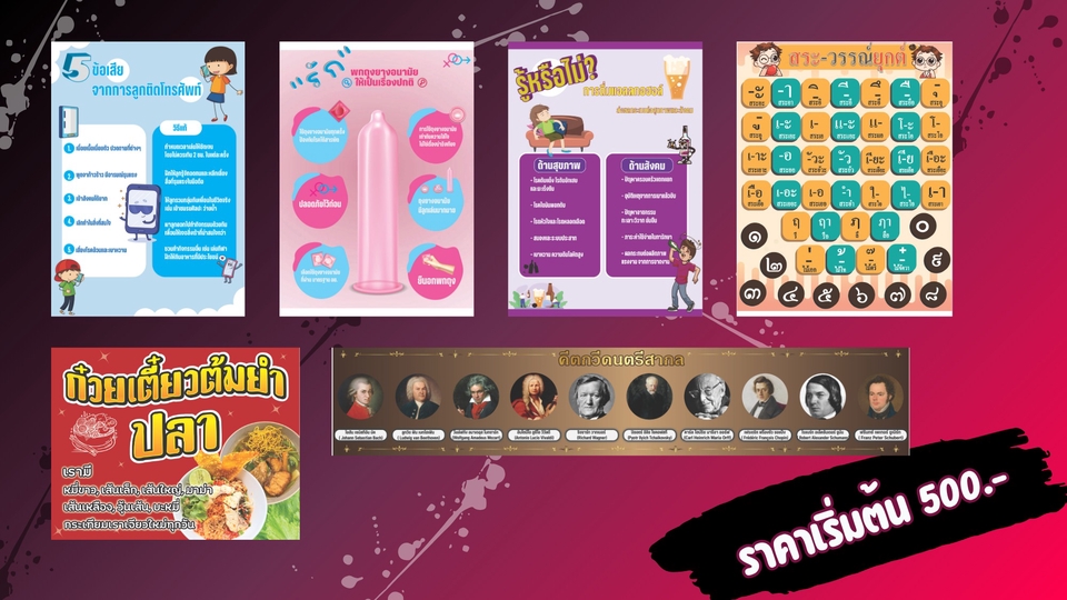 -โปสเตอร์ ราคาเริ่มอยู่ที่ 350.- แล้วแต่ขนาดและความละเอียด -สื่อการสอน ราคาเริ่มต้น 350.-แล้วแต่ขนาดและความละเอียด -ป้ายหน้าร้านหรือเมนู ราคาเริ่มต้นอยู่ที่ 450.- แล้วแต่ขนาดและความละเอียด -แก้งานได้ 1-3 รอบ