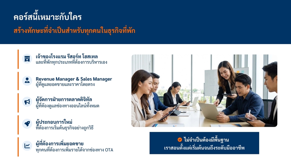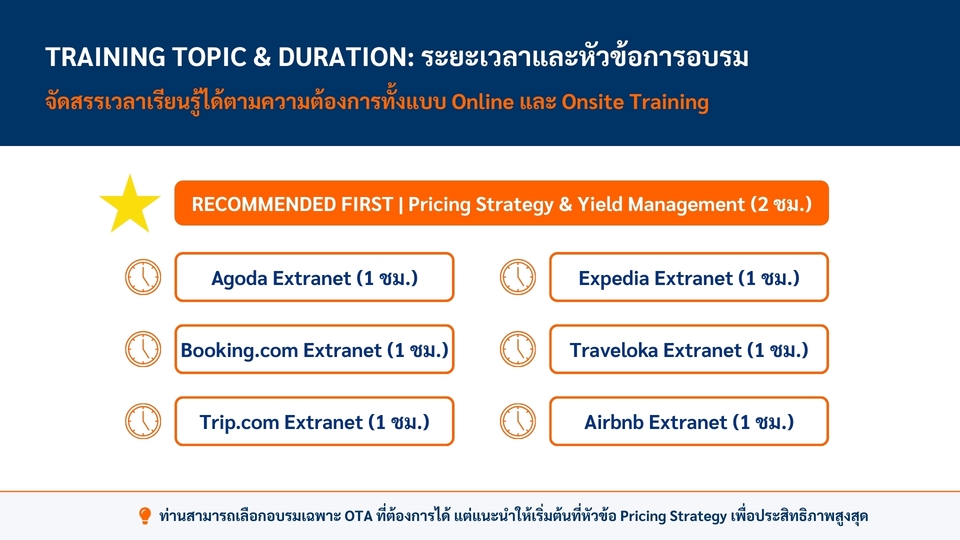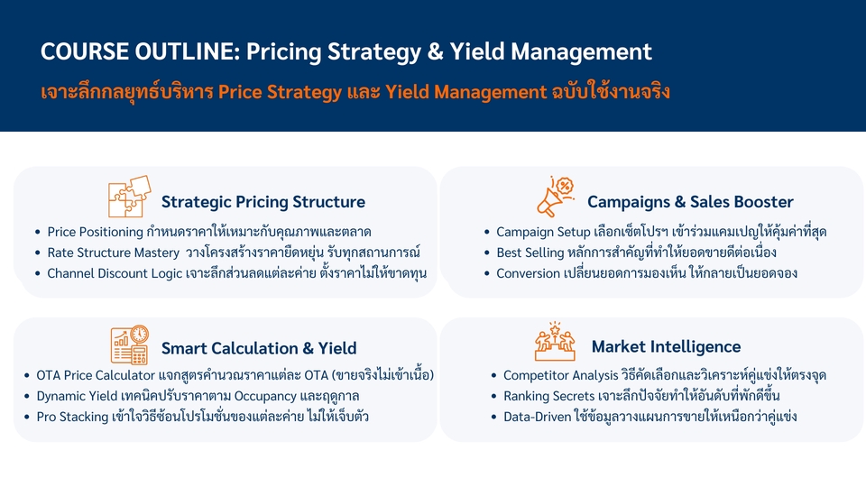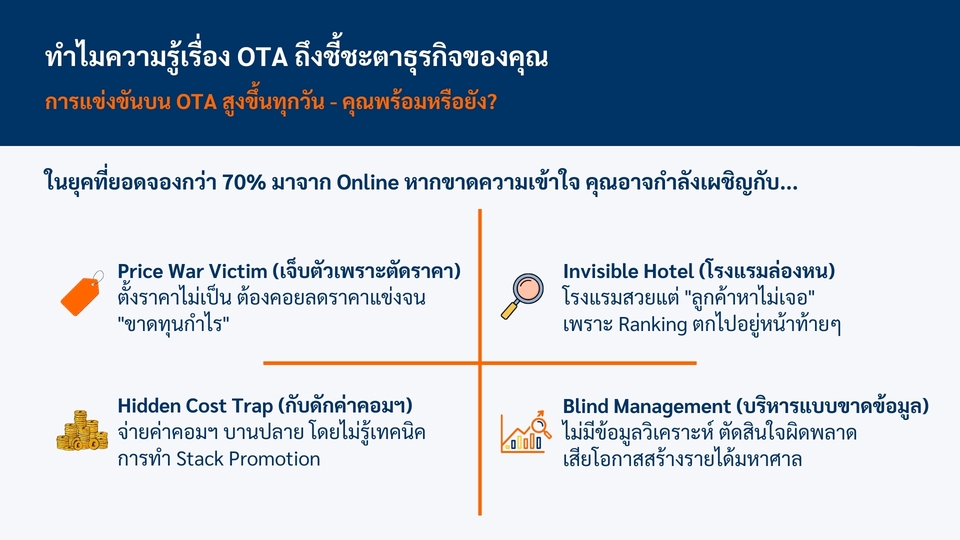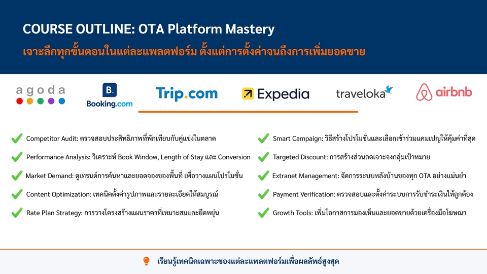 âķïļ āļĢāļąāļāļŠāļāļāđāļĨāļ°āđāļāļĢāļāļāļīāđāļāļāļēāļĢāļāļēāļĒāđāļĨāļ°āļāļēāļĢāļāļĨāļēāļāļāļāļāđāļĨāļāđāļāļ OTA āđāļĨāļ°āļāļēāļĢāļ§āļēāļāđāļāļāļāļĢāļīāļŦāļēāļĢāļĢāļēāļĒāđāļāđāļŠāļģāļŦāļĢāļąāļāđāļĢāļāđāļĢāļĄāļāļĩāđāļāļąāļāļāļļāļāļāļĢāļ°āđāļ āļ ð āļāļĢāļ°āļŠāļāļāļēāļĢāļāđāļāļēāļĢāļāļēāļĒ, āļāļēāļĢāļāļĨāļēāļāļāļāļāđāļĨāļāđāļĢāļ§āļĄāđāļāļāļķāļāļāļēāļĢāļ§āļēāļāđāļāļāļāļĢāļīāļŦāļēāļĢāļĢāļēāļĒāđāļāđāļŠāļģāļŦāļĢāļąāļāđāļĢāļāđāļĢāļĄāļāļĩāđāļāļąāļāļĄāļēāļāļāļ§āđāļē 15 āļāļĩ ð āļŠāļāļāļ§āļīāļāļĩāļāļēāļĢ Set up, āđāļāļīāđāļĄ content score āđāļĨāļ°āļāļēāļĢāđāļāđāļāļēāļāļāļļāļ functions āđāļāļĢāļ°āļāļāļŦāļĨāļąāļāļāđāļēāļāļāļļāļ OTA ð āļŠāļāļāļ§āļīāļāļĩāļāļēāļĢāļŠāļĢāđāļēāļāļāļēāļĢāļēāļāļŠāļģāļŦāļĢāļąāļāļāļģāļāļ§āļāđāļĨāļ°āļ§āļēāļāđāļāļāļĢāļēāļĒāđāļāđāđāļāļāļāđāļēāļāđ āļāļĩāđāđāļŦāļĄāļēāļ°āļŠāļĄāļāļąāļāļāļĩāđāļāļąāļāđāļāđāļĨāļ°āđāļāļ ð āđāļāļ°āļāļģāļ§āļīāļāļĩāļāļēāļĢāļ§āļēāļ Rate Structure, Yield Management āđāļĨāļ°āļĢāļēāļāļēāļāļēāļĄ segment āđāļāđāļĨāļ°āļāļĢāļ°āđāļ āļ ð āđāļāļ°āļāļģāđāļāļāļāļīāļāđāļāļāļēāļĢāļāļģāļāļēāļĢāļāļĨāļēāļāļāļāļāđāļĨāļāđāļāļ OTA āđāļŦāđāđāļāđāļāļĨāđāļĨāļ°āļāļĢāļ°āļŠāļāļāļ§āļēāļĄāļŠāļģāđāļĢāđāļ ð āļĢāļēāļāļēāļāļķāđāļāļāļĒāļđāđāļāļąāļāļāļāļēāļāļāļāļāđāļĢāļāđāļĢāļĄ āđāļĨāļ°āđāļāļ·āđāļāļŦāļēāļāļĩāđāļāđāļāļāļāļēāļĢ ð āļŠāļāļāđāļāđāļāļąāđāļāđāļāļ online āđāļĨāļ° on-site āļĢāļ°āļĒāļ°āđāļ§āļĨāļēāļāļāļāđāļāđāļĨāļ°āļŦāļąāļ§āļāđāļ ð Price Strategy āļāļēāļĢāļ§āļēāļāđāļāļāļĢāļēāļāļēāđāļĨāļ°āļāļģāļāļ§āļāļĢāļēāļāļēāļāļĩāđāļāđāļāļāđāļŠāđāđāļ OTA (1 āļāļĄ.) ð Agoda āļāļēāļĢāđāļāđāļāļēāļāļĢāļ°āļāļāļāļļāļāļāļąāļāļāđāļāļąāđāļ (1 āļāļĄ.) ð Booking.com āļāļēāļĢāđāļāđāļāļēāļāļĢāļ°āļāļāļāļļāļāļāļąāļāļāđāļāļąāđāļ (1 āļāļĄ.) ð Expedia āļāļēāļĢāđāļāđāļāļēāļāļĢāļ°āļāļāļāļļāļāļāļąāļāļāđāļāļąāđāļ (1 āļāļĄ.) ð Traveloka āļāļēāļĢāđāļāđāļāļēāļāļĢāļ°āļāļāļāļļāļāļāļąāļāļāđāļāļąāđāļ (1 āļāļĄ.) ð Trip.com āļāļēāļĢāđāļāđāļāļēāļāļĢāļ°āļāļāļāļļāļāļāļąāļāļāđāļāļąāđāļ (1 āļāļĄ.) ð Airbnb āļāļēāļĢāđāļāđāļāļēāļāļĢāļ°āļāļāļāļļāļāļāļąāļāļāđāļāļąāđāļ (1 āļāļĄ.) āļāļąāđāļāļāļāļāļāļēāļĢāļāļģāļāļēāļ 1. āļŠāļĢāļļāļāļĢāļēāļĒāļĨāļ°āđāļāļĩāļĒāļāļāđāļēāļāđ āļāļąāļāļĨāļđāļāļāđāļēāđāļāđāļĢāļ·āđāļāļāļāļĢāļ°āđāļ āļāļāļāļĢāđāļŠāļāļēāļĢāđāļĢāļĩāļĒāļāļāļĩāđāļāđāļāļāļāļēāļĢ āļĢāļ°āļĒāļ°āđāļ§āļĨāļēāđāļāļāļēāļĢāđāļĢāļĩāļĒāļ āđāļĨāļ°āļŠāļāļēāļāļāļĩāđ (āļāđāļēāļĄāļĩ) āđāļāļ·āđāļāđāļāđāļāļĢāļ°āđāļĄāļīāļāļĢāļēāļāļē 2. āļŠāđāļāđāļāđāļŠāļāļāļĢāļēāļāļēāđāļŦāđāļĨāļđāļāļāđāļē 3. āļĨāļđāļāļāđāļēāļāļĢāļ§āļāļŠāļāļāļāđāļāļāļāļĨāļāđāļāđāļāđāļŠāļāļāļĢāļēāļāļēāđāļĨāļ°āļāļģāļĢāļ°āđāļāļīāļ 4. āļĢāļ°āļāļāļĒāļ·āļāļĒāļąāļāļāļēāļĢāļĢāļąāļāļāļģāļĢāļ°āđāļāļīāļ āļāļēāļāļāļđāđāļĢāļąāļāļāļēāļāļāļ°āđāļĢāļīāđāļĄāļāļēāļāđāļŦāđāļāļēāļĄāļāļīāļ§ 5. āļāļģāļāļēāļĢāļāļķāļāļāļāļĢāļĄāđāļāļŦāļąāļ§āļāđāļāļāļĩāđāļāļāļĨāļāđāļ§āđ āđāļĨāļ°āļāļąāļāļāļēāļĄāđāļāđāļāļĨāļāļāļāļēāļĢāļāļķāļāļāļāļĢāļĄ 6. āđāļĄāļ·āđāļāļāļāļāļēāļĢāļāļķāļāļāļāļĢāļĄāļāļąāđāļāļŦāļĄāļāđāļĨāđāļ§ āļāļ·āļāđāļāđāļāļŠāļīāđāļāļŠāļļāļāļāļēāļĢāđāļŦāđāļāļĢāļīāļāļēāļĢ
