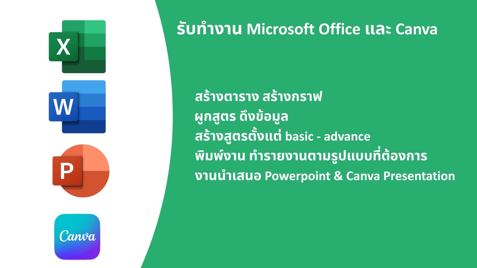 รับจ้างทำงานที่เกี่ยวกับ Microsoft Office ทั้ง excel, word, powerpoint และ canva ทำตารางข้อมูล จัดการข้อมูล ผูกสูตรต่างๆ ลงตาราง เพื่อนำไปต่อยอด ทำกราฟแท่ง กราฟแผนภูมิวงกลม กราฟเส้น และกราฟอื่นๆ จากข้อมูลที่มี รับพิมพ์งาน 2 ภาษา ทั้ง Thai Eng รับทำรายงานวิชาต่าง ๆ รับทำ Presentation (รวมหาข้อมูล) ขั้นตอนการทำงาน 1. แจ้งรายละเอียดของงานเช่น มีข้อมูลอะไร scope ของตัวงาน ระยะเวลาดำเนินการ และอื่นๆตามความประสงค์ 3. ตกลงราคา และ ค่าบริการ 4. เริ่มงานหลังจากการชำระเงิน 5. ผู้ว่าจ้างตรวจความเรียบร้อยของงาน (แก้ไขฟรี 3 ครั้ง) 6. ส่งมอบงาน เป็นไฟล์เอกสารตามที่ตกลง