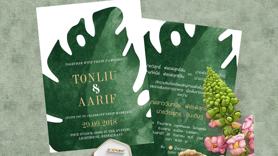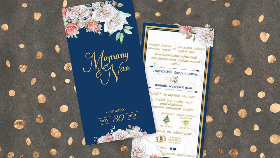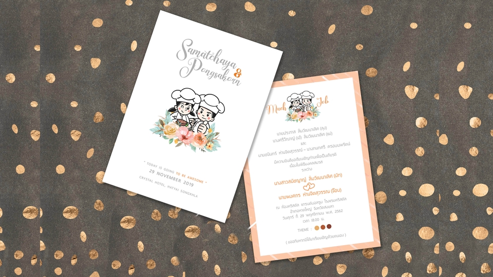 เพราะการ์ดแต่งงาน คือความประทับใจแรกของผู้ได้รับเชิญ และสามารถบอกถึงความตั้งใจของคู่บ่าวสาว เราจึงใส่ใจในรายละเอียดต่าง ๆ ตามความต้องการของเจ้าบ่าวเจ้าสาว ไม่ว่าจะเป็นรูปแบบไหน ขอเพียงคุณแจ้งมา เราจะออกแบบการ์ดในรูปแบบของคุณ รายละเอียดราคาเพิ่มเติม หากมีการให้วาดตัวการ์ตูนพิเศษ จะมีค่าใช้จ่ายเพิ่มเติม 400 บาท หรือโลโก้ที่ยากเป็นพิเศษ จะมีค่าใช้จ่ายเพิ่ม 200 บาท ขั้นตอนการทำงาน 1. ลูกค้าส่งรูปแบบที่ชอบเพื่อเป็นแนวทางในการวางแบบ และรายละเอียดข้อความภายในการ์ด 2. จะทำการวางแบบและส่งให้ตรวจ ภายใน 1 สัปดาห์ 3. ปรับแบบ และแก้ไข หลังจากมีการส่งแบบครั้งแรกแล้ว หากมีจุดที่ต้องการปรับเปลี่ยน 4. หลังจากคอนเฟริม์แบบแล้ว ทางร้านจะทำการส่งไฟล์ เป็นไฟล์ JPG และ AI ให้ลูกค้า เพื่อเป็นการปิดงาน