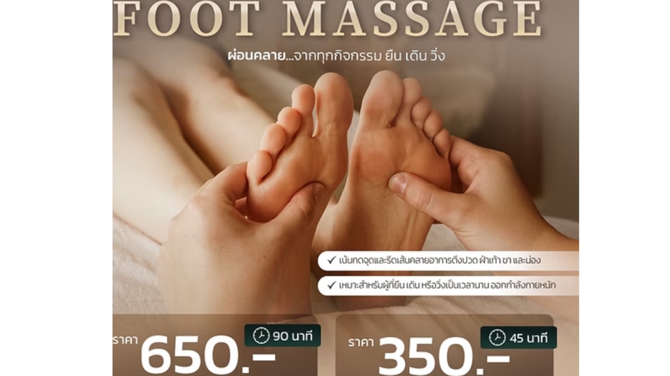 - ผ่อนคลายความเหนื่อยล้าของวันด้วย Foot Massage ศูนย์รวมเส้นประสาทและหลอดเลือด - เน้นกดจุดและรีดเส้นคลายอาการตึงปวด ฝ่าเท้า ขา และน่อง - ใช้เทคนิครีดคลายและกดจุดสะท้อนฝ่าเท้า เพิ่มการไหลเวียน เพิ่มพลังงาน - ส่งเสริมการทำงานของระบบต่างๆให้ทำงานได้ดีขึ้น - เหมาะสำหรับผู้ที่ยืน เดิน หรือวิ่งเป็นเวลานาน ออกกำลังกายหนัก