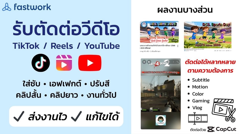 รับตัดต่อวิดีโอ TikTok / Reels / YouTube ใส่ซับ เอฟเฟกต์ ปรับสี คลิปสั้น คลิปยาว งานทั่วไป