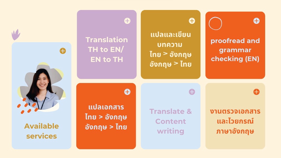 - experienced in ENG content writing (creative and academic writing) and translation from TH to ENG and ENG to TH. - experienced in publication layout design (Canva, Adobe InDesign). - experienced in Conversational English and Academic English tutoring. - Past English Proficiency Test: IELTS 8.0 (taken in 2021)