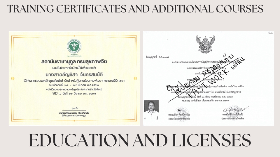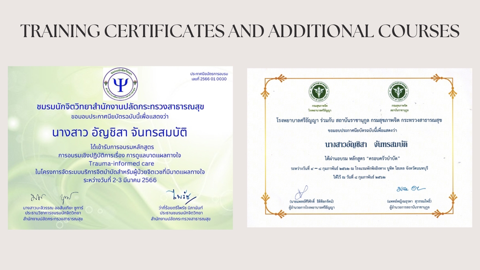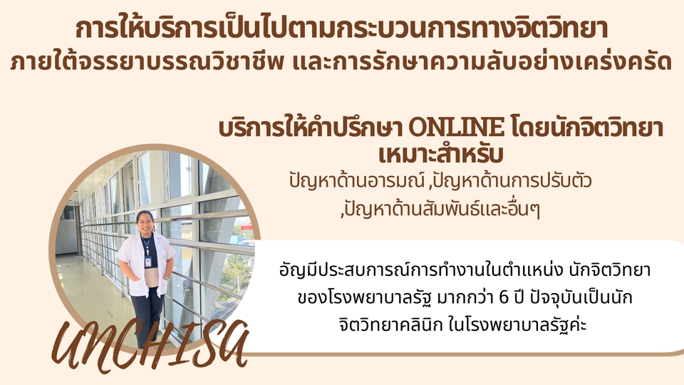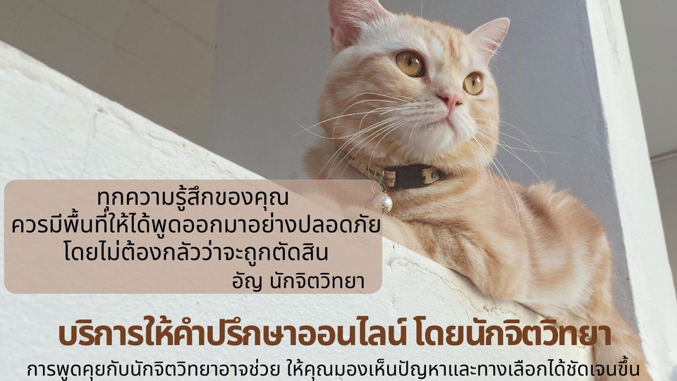 บางครั้ง เรื่องราวหรือเหตุการณ์ที่คุณกำลังเผชิญ อาจทำให้รู้สึกไม่สบายใจ เครียด วิตกกังวล หรือทุกข์ใจ จนไม่รู้จะเริ่มต้นเล่าให้ใครฟังดี หรือแม้แต่คนใกล้ตัว ก็อาจยังไม่พร้อมจะเข้าใจทั้งหมด ที่นี่คือ “พื้นที่ปลอดภัย” สำหรับคุณ พื้นที่ที่คุณสามารถพูดในสิ่งที่ค้างอยู่ในใจได้อย่างสบายใจ โดยไม่ถูกตัดสิน อัญพร้อมอยู่ข้างคุณในกระบวนการทำความเข้าใจตัวเองและปัญหา เพื่อค้นหาแนวทางรับมือที่เหมาะกับตัวคุณ หากคุณกำลังเครียด เหนื่อย ท้อ หรือรู้สึกว่าชีวิตติดอยู่กับปัญหาเดิมๆ คุณไม่จำเป็นต้องเผชิญกับมันเพียงลำพัง การพูดคุยกับนักจิตวิทยาอาจช่วยให้คุณมองเห็นปัญหาและทางเลือกได้ชัดเจนขึ้น เหมาะสำหรับผู้ที่มีปัญหา เช่น การจัดการอารมณ์: เครียดสะสม วิตกกังวล ซึมเศร้า เหนื่อยล้า การปรับตัวในชีวิต: ความเครียดจากงาน หมดไฟ ถูกบูลลี่ ความสัมพันธ์: ครอบครัว คู่รัก เพื่อน เพื่อนร่วมงาน รวมทั้งปัญหาชีวิตและสุขภาพจิตอื่นๆ ขั้นตอนการให้บริการ 1. พูดคุย-สอบถามปัญหาที่ต้องการปรึกษา 2. นัดหมายวันเวลา และช่องทาง 3. ตกลงขอบเขตการให้บริการและการรักษาความลับ 4. ชำระค่าบริการ 5. รับลิงค์ ผ่านทางข้อความแชท ประวัติการศึกษา วิทยาศาสตรบัณฑิต (จิตวิทยาคลินิกและชุมชน) ,มหาวิทยาลัยรามคำแหง วิทยาศาสตรบัณฑิต (จิตวิทยาอุตสาหกรรมและองค์การ) ,มหาวิทยาลัยบูรพา การอบรมต่างๆ - ผ่านการอบรมหลักสูตร “ศิลปะบำบัดสำหรัผู้บกพร่องทาพัฒนาการและสติปัญญา” สถาบันราชานุนุกูล กรมสุขภาพจิต การอบรมเชิงปฎิบัติการ “กาดูแลบาดแผลทางใจ Trauma-informed care ”จากชมรมนักจิตวิทยาสำนักงานปลัดกระทรวงสาธารณสุข - ผ่านการอบรมหลักสูตร “ครอบครัวบำบัด” จากโรงพยาบาลศรีธัญญา ร่วมกับ สถาบันราชานุนุกูล กรมสุขภาพจิต กระทรวงสาธารณสุข - หลักสูตร“การบำบัดผู้ป่วยยาและสารเสพติดด้วยการปรับเปลี่ยนความคิดและพฤติกรรม (CBT) Level I ” จากสถาบันบำบัดรักษาและฟื้นฟูผู้ติดยาเสพติดแห่งชาติบรมราชชนนีกรมการแพทย์ กระทรวงสาธารณสุข