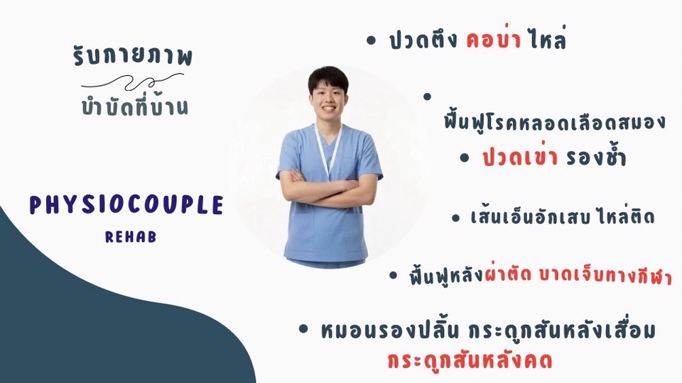 ฿2,000- ออฟฟิศซินโดรม - รองช้ำ เจ็บเอ็นร้อยหวาย - เอ็นหัวไหล่ เอ็นหัวเข่าอักเสบ - ปวดหลังเรื้อรัง, หมอนรองกระดูกปลิ้นทับเส้นประสาท - กายภาพบำบัดหลังผ่าตัด ผู้สูงอายุ - กายภาพบำบัดผู้ป่วยระบบประสาทและสมอง