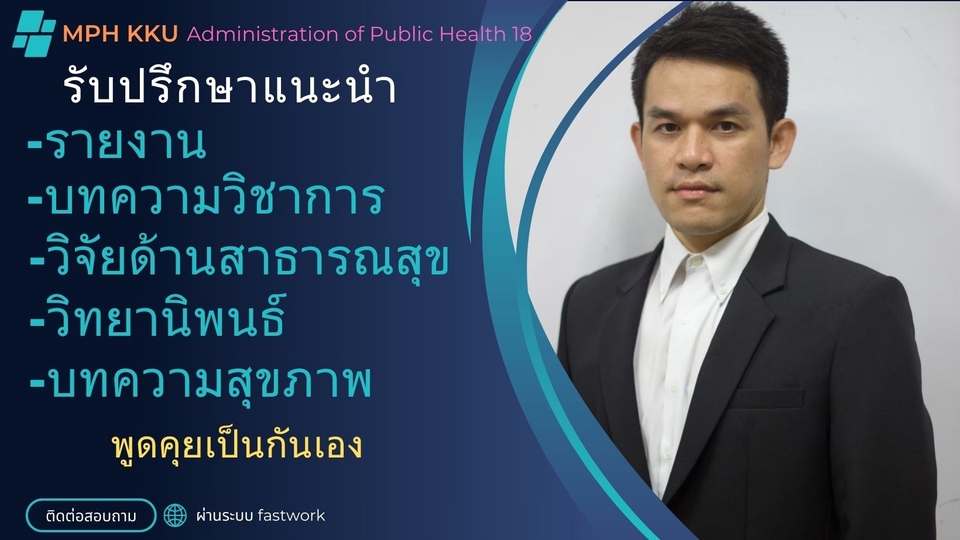 1.การศึกษา -ป.ตรี วทบ.ฟิสิกส์ คณะวิทยาศาสตร์ ม.ราชภัฏเลย -ป.ตรี สาธารณสุขศาสตรบัณฑิต ม.ขอนแก่น -ป.โท สาธารณสุขศาสตรมหาบัณฑิต(บริหารสาธารณสุข) ม.ขอนแก่น 2.ประสบการณ์ทำงานสาธารณสุข 14 ปี 3.งานที่รับ -รับปรึกษาแก้ไขรายงาน,บทคัดย่อ,งานวิจัย,วิทยานิพนธ์,ตีพิมพ์วารสาร(สาธารณสุข,การแพทย์,การพยาบาล) 4.ขั้นตอนการทำงาน -พูดคุยปรึกษารายละเอียดงานพร้อมบอก conceptงานที่ต้องการ -สามารถพูดคุยปรับแก้ไขงานได้