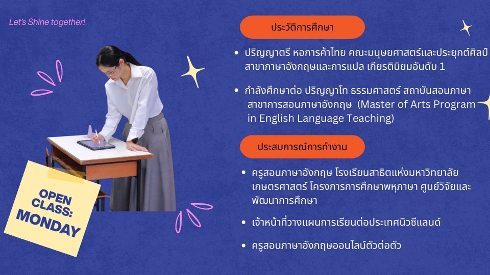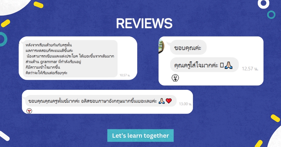฿350เรียนภาษาอังกฤษตัวต่อตัว Online ผ่าน Google Meet / Line หรือ Zoom เนื้อหาการสอน ปรับตามความสนใจและจังหวะการเรียนรู้ของผู้เรียน สามารถเลือกวันและเวลาที่สะดวก (ทักถามวันและเวลาที่ว่างกับครูได้ค่ะ)