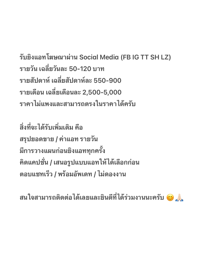 รับยิงแอทโฆษณาผ่าน Social Media (FB IG TT SH LZ) รายวัน เฉลี่ยวันละ 50-120 บาท รายสัปดาห์ เฉลี่ยสัปดาห์ละ 550-900 รายเดือน เฉลี่ยเดือนละ 2,500-5,000 ราคาไม่แพงและสามารถตรงในราคาได้ครับ สิ่งที่จะได้รับเพิ่มเติม คือ สรุปยอดขาย / ค่าแอท รายวัน มีการวางแผนก่อนยิงแอททุกครั้ง คิดแคปชั่น / เสนอรูปแบบแอทให้ได้เลือกก่อน ตอบแชทเร็ว / พร้อมอัพเดท / ไม่ดองงาน สนใจสามารถติดต่อได้เลยและยินดีที่ได้ร่วมงานนะครับ 😊🙏🏻 ขั้นตอนการทำงาน 1. ยิงแอทโฆษณาผ่าน Social Media (FB IG TT SH LZ) 2. มีรายวัน / รายสัปดาห์ / รายเดือน 3. สิ่งที่จะได้รับเพิ่มเติม คือ 4. สรุปยอดขาย / ค่าแอท รายวัน 5. มีการวางแผนก่อนยิงแอททุกครั้ง 6. คิดแคปชั่น / เสนอรูปแบบแอทให้ได้เลือกก่อน 7. ตอบแชทเร็ว / พร้อมอัพเดท / ไม่ดองงาน