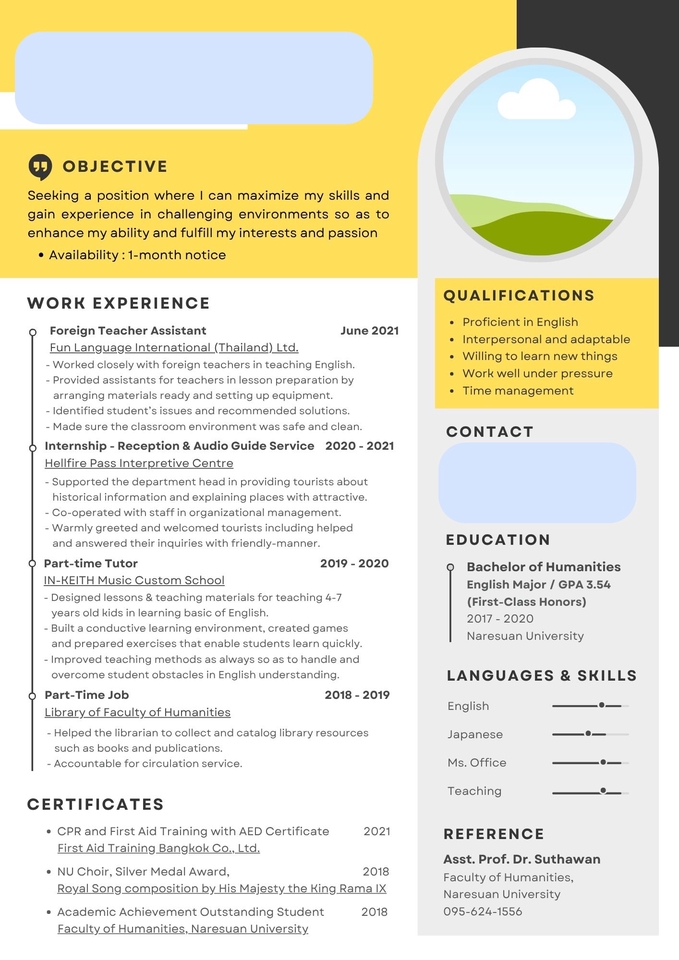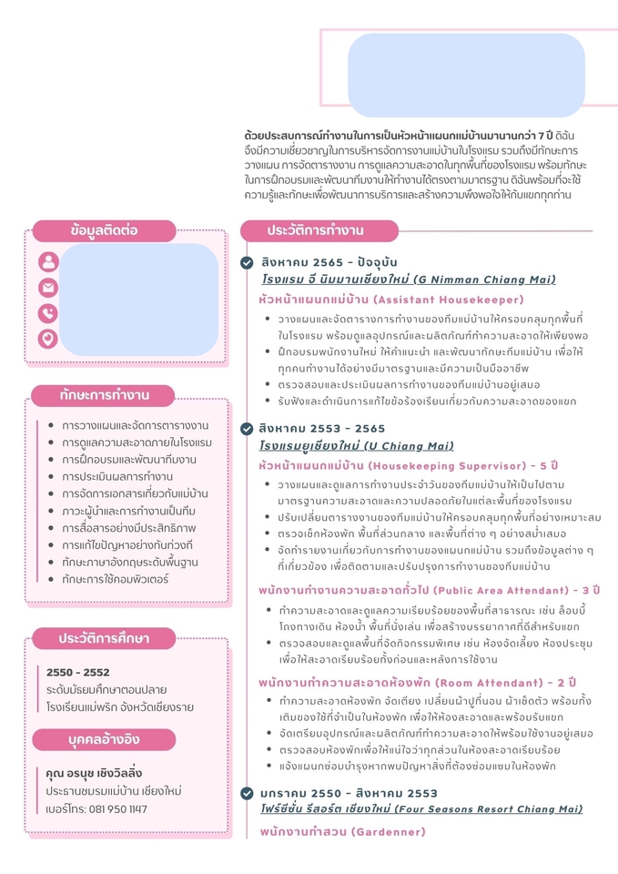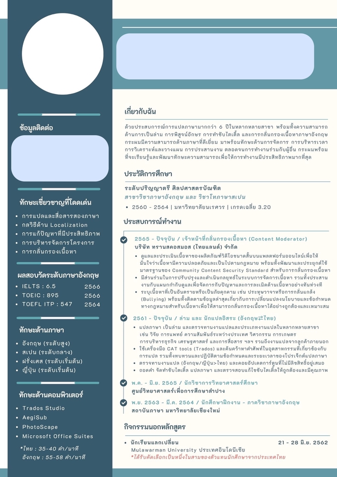 รับทำเรซูเม่ภาษาอังกฤษและภาษาไทย ด้วยประสบการณ์การทำเรซูเม่มาแล้วกว่า 300 ฉบับ *ฟรีแลนซ์มีประสบการณ์ทำเรซูเม่ให้กับทั้งระดับ Manager ระดับหัวหน้า และในหลากหลายสาขาอาชีพ ตลอดจนนักศึกษาจบใหม่และนักศึกษาที่เตรียมไปฝึกงาน *ฟรีแลนซ์จะพยายามคัดสรรทักษะความสามารถของลูกค้าให้ตรงกับตำแหน่งงานที่จะไปสมัครให้มากที่สุด *ฟรีแลนซ์เคยทำงานให้กับเอเจนซี่รับทำเรซูเม่จ้าวดัง จึงได้ผ่านการเรียนรู้และปรับปรุงวิธีการเขียนเรซูเม่ด้วยประสบการณ์และคำสอนของบอสมาอย่างเนิ่นนาน *ฟรีแลนซ์อาจมีการปฏิเสธงานที่ยากเกินความสามารถ เพราะฟรีแลนซ์ถือว่าคุณภาพของงานเป็นเรื่องสำคัญที่สุด *ฟรีแลนซ์ยินดีรับฟังทุกความคิดเห็น ยินดีตอบทุกคำถามที่เกี่ยวข้อง และยินดีแก้ไขให้ไม่จำกัดจำนวนครั้ง *ราคาสามารถพูดคุยและต่อรองได้