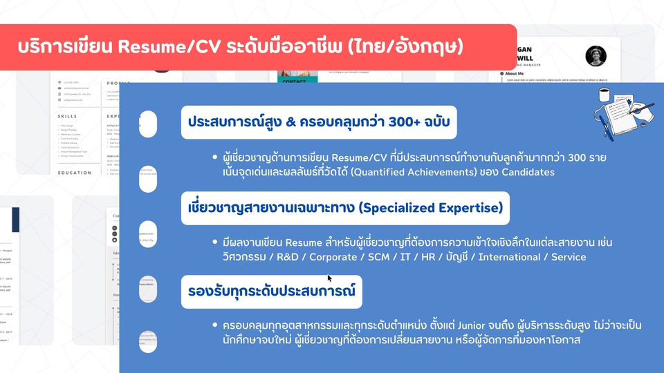 รับทำเรซูเม่ภาษาไทย-อังกฤษระดับมืออาชีพโดย Resume Writer ที่มีประสบการณ์ทำเรซูเม่มาแล้วกว่า 300 ฉบับ