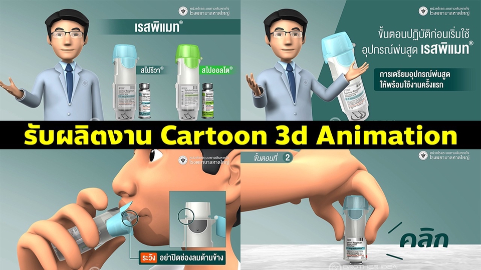 วีดีโอ 3D Character Animation แนะนำการใช้เครื่องมืออุปกรณ์พ่นสูด Respimat Inhaler โดยมีผู้บรรยายเป็นตัวการ์ตูนคุณหมอ แนะนำขั้นตอนการใช้งานอย่างละเอียด พร้อมทั้ง Motion Graphic ประกอบ ขั้นตอนการทำงาน 1. script รับข้อมูลจากลูกค้า จากนั้นนำมาเขียนเรียงลำดับ เล่าเรื่องราวเป็นข้อๆ ให้ครบถ้วน ส่งให้ลูกค้าตรวจความถูกต้อง ครบถ้วน 2. storyboard นำข้อความจาก script มาจัดทำเป็นภาพนิ่ง แสดงมุมกล้อง ท่าทาง ตำแหน่งของตัวละคร ท่าทางของตัวละคร จัดวางเป็นภาพ เรียงลำดับตามการเล่าเรื่อง ตั้งแต่ต้นจนจบ ส่งให้ลูกค้าตรวจความถูกต้อง ครบถ้วน 3. ออกแบบตัวละคร ที่จะต้องใช้ขึ้นโมเดล 3 มิติ ส่งให้ลูกค้าตรวจความถูกต้อง 4. ขึ้นโมเดล 3 มิติ ตัวละคร / ฉากต่างๆ ส่งให้ลูกค้าตรวจความถูกต้อง 5. setup กระดูกให้กับตัวละคร เพื่อเตรียมเคลื่อนไหวตาม storyboard ให้สามารถทำท่าต่างๆได้ 6. เริ่มทำการ animation ต่างๆ แต่ละฉาก ตาม storyboard 7. ส่ง draft animation แต่ละฉากให้ลูกค้าตรวจความถูกต้อง 8. render งาน 3d ออกมา เพื่อนำไปตกแต่งภาพในแต่ละฉาก 9. ตัดต่องานทั้งหมด ในเสียงดนตรี sound effect 10. ส่งให้ลูกค้าตรวจความถูกต้อง